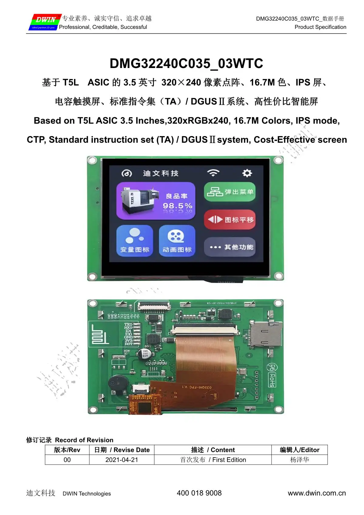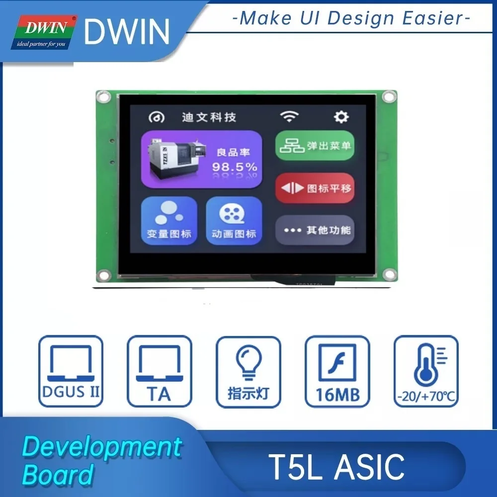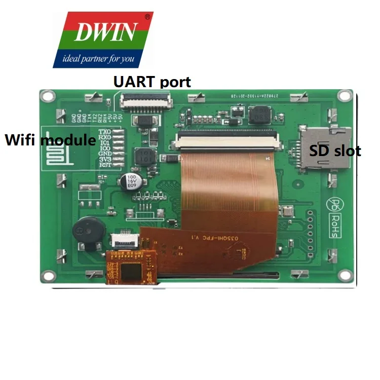 DWIN 3,5 дюймов, 320*240 Разрешение, 24 бит, Цвет, товарного сорта высокого стандарта на тонкопленочных транзисторах на тонкоплёночных транзисторах ЖК-дисплей модуль Дисплей HMI.Горячая Распродажа и самое приветствуемое 3,5 дюймов высокий стандарт на тонкопленочных транзисторах на тонкоплёночных транзисторах ЖК-дисплей модуль Дисплей HMI с сенсорным экраном Панель. DMG32240C035_03W-это интеллектуальный сенсорный экран (сенсорный экран может быть удален) с портом UART, который может управляться любым MCU с помощью команд, поэтому его можно использовать в качестве TFT дисплея и сенсорного контроллера в различном электронном оборудовании. Дисплей DWIN-ваш лучший выбор для проекта HMI.DMG32240C035 _ 03W ЖК-дисплей на основе собственного процессора DWIN T5L, который включает в себя двухъядерный графический интерфейс и ОС. GUI kernel может поддерживать дизайн интерфейса пользовательского интерфейса на основе разработанного программного инструмента DWIN с мощной функцией, включая данные, текст, кривые, базовую графику, загрузку значения ключа и т. д.Ядро ос может быть открыто клиенту для второго развития, в рамках ОС compilate или Keil C51, усиливая функцию GUI.Modbus поддерживается для связи с PLC.Любой MCU может быть подключен к интеллектуальному дисплею DWIN. Например, Arduino,STM32 или ESP32 и т. Д.Аксессуары нужно покупать отдельно.