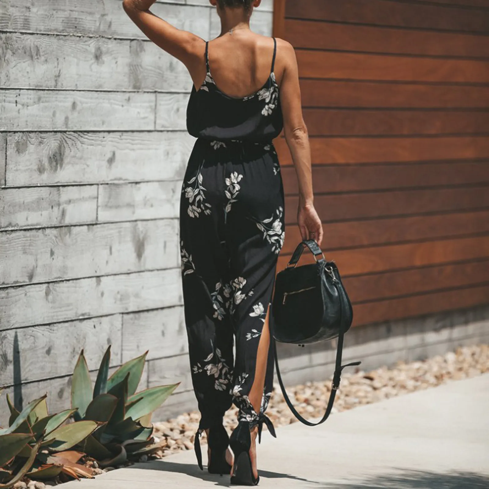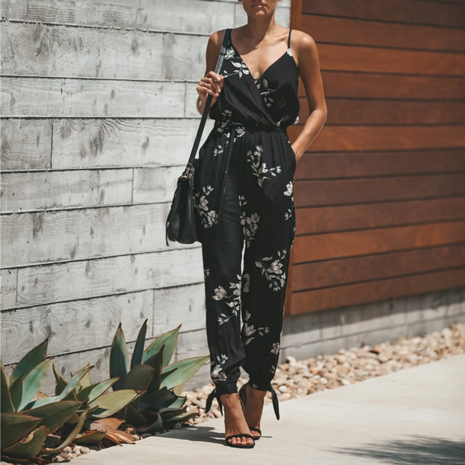 Комбинезон женский в стиле бохо, Модный повседневный праздничный Свободный Длинный комбинезон без рукавов, с цветочным принтом, V-образным вырезом, с поясом, # g3