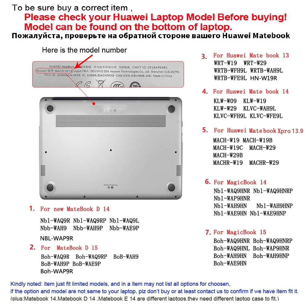 2020 Новый защитный чехол для Huawei Matebook X Pro 13,9, чехол с защитой от царапин, чехол для funda Huawei Matebook 13 дюймов для Huawei Matebook 14 дюймов Для всех покупателейВнимание покупателя: Пожалуйста, внимательно прочитайте следующие детали, чтобы избежать недоразумений, спасибо! Чехол для ноутбука подходит для:Эта модель подходит для:Уважаемые покупателиСпасибо за ваш заказ, мой друг Здравствуйте, обратите внимание: для моделей ноутбуков Huawei,Пожалуйста, обратите внимание 1: Найдите свою конкретную модель на задней части ноутбука Эта модель подходит для: 1. Для Huawei Mate book 13 :( 2019) WRT-W19 WRT-W29Для Huawei Mate book 13 :( 2020) WRTB-WFH9L WRTB-WAH9L WRTB-WFE9L HN-W19R.2. Для Huawei Mate book 14 :(2019) KLW-W09 KLW-W19 KLW-W29Для Huawei Mate book 14 :( 2020) KLVC-WAH9L KLVC-WFH9L KLVC-WFE9L.3. Для Huawei Mate book Xpro MACH-W19 MACH-W19B MACH-W19C MACH-W29 MACH-W29BДля Huawei Mate book Xpro(2019) MACHR-W19 MACHR-W29.4. Для MateBook D 14:Nbl-WAQ9R Nbl-WAQ9RP Nbl-WAQ9L Nbb-WAH9Nbb-WAH9P Nbb-WAE9P NBL-WAP9R.5. Для MagicBook 14:Nbl-WAQ9HNR Nbl-WAQ9HNRP Nbl-WAP9HNR Nbl-WAH9HNNbl-WAH9HNP Nbl-WAE9HN Nbl-WAE9HNP.6. Для MateBook D 15:Boh-WAQ9R Boh-WAQ9RP BoB-WAH9BoB-WAH9P BoB-WAE9P Boh-WAP9R.7. Для MagicBook 15:Boh-WAQ9HNR Boh-WAQ9HNRP Boh-WAQ9HNLBoh-WAH9HN Boh-WAH9HNP Boh-WAE9HN Boh-WAP9HNR. 2: выберите правильный товар.3: Если вы ничего не понимаете, пожалуйста, свяжитесь с нами4: мы можем помочь вам Пожалуйста, проверьте заднюю часть вашего ноутбука, вы можете увидеть модель, напечатанную там, в противном случае вы не можете использовать его, большое спасибо!Характеристика1. Прочная защита всего тела;2. Устойчивый к царапинам материал;В комплект входит: 1 чехол для ноутбука Huawei MateBook / Honor MagicBook