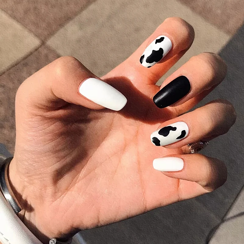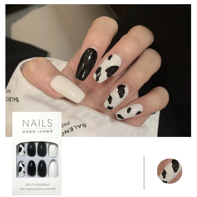 24 шт., накладные ногти с рисунком коровы, белые, черные