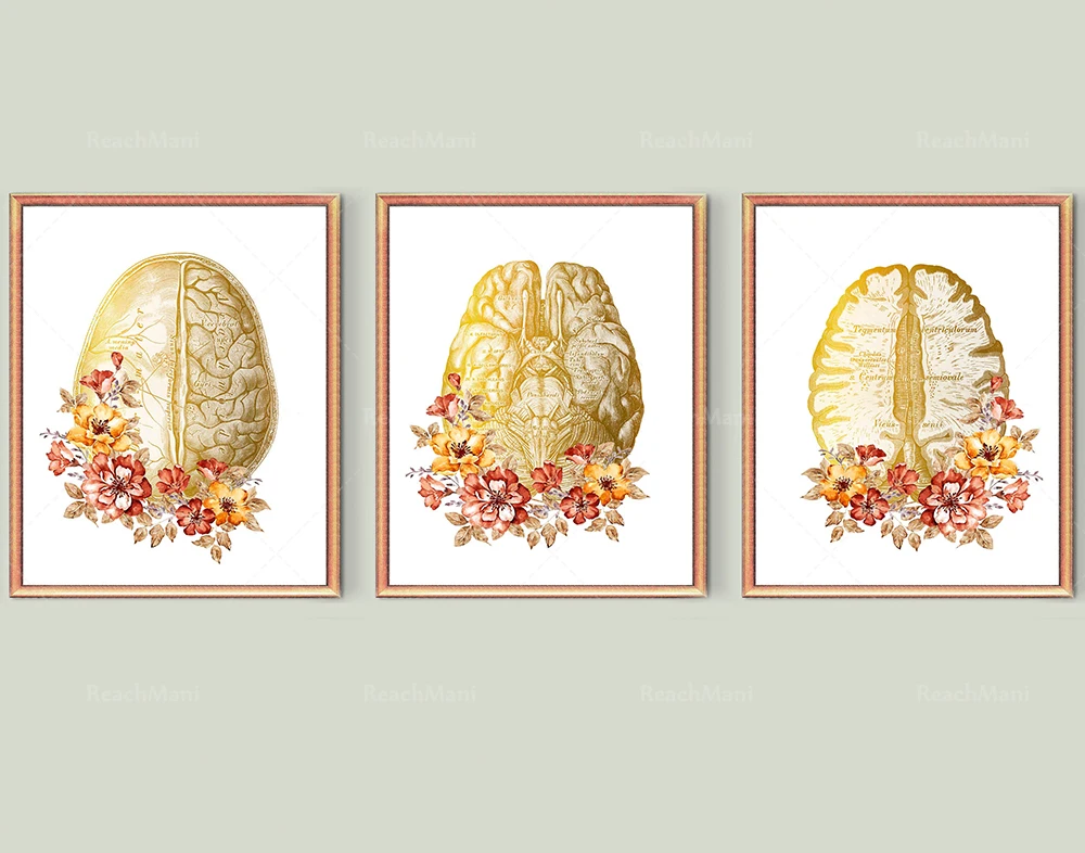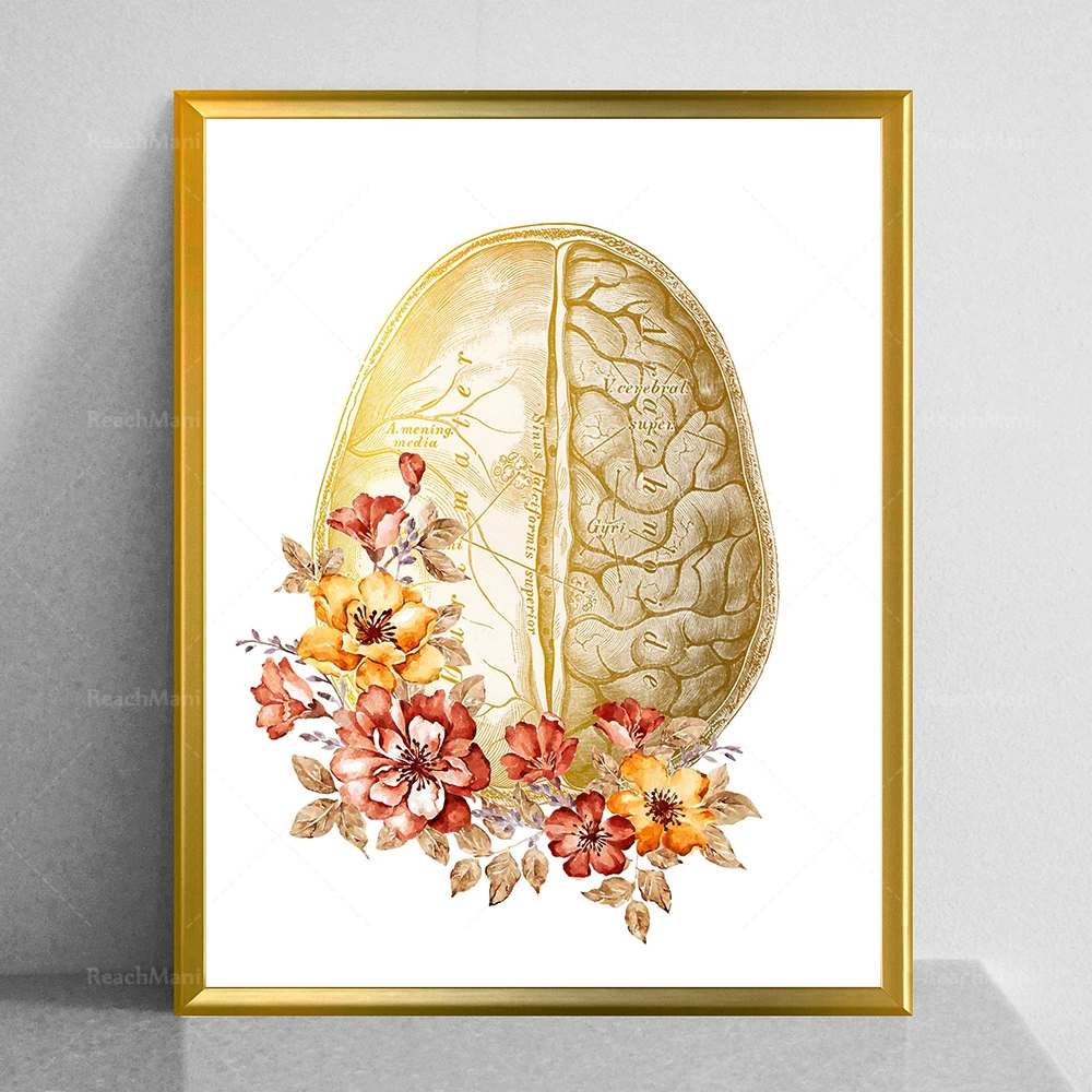 Неврология арт золото анатомический мозг и цветы плакат подробный анатомии мозга современные медицинские декор, подарок-Gi