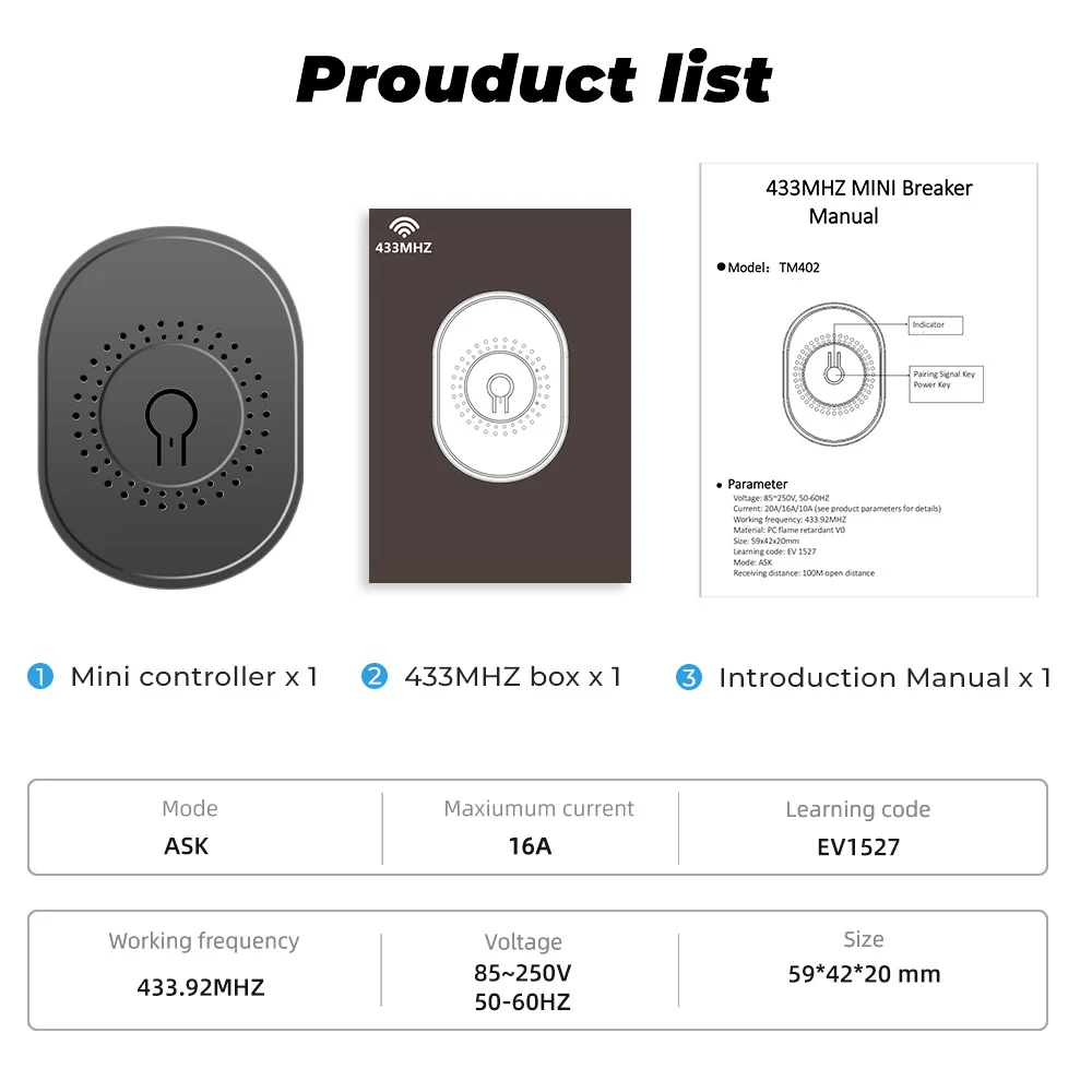 Напряжение: 85 ~ 250 В, 50-60 ГцТок: 16АРабочая частота: 433,92 МГцМатериал: Поликарбонат огнестойкий V0Размер: 59x42x20ммКод обучения: EV 1527Режим: ASKРасстояние приема: 100 м открытое расстояниеПульт дистанционного управления совместим с чипом EV1527 2262. Не поддерживает пульт дистанционного управления HCS101, HCS200, HCS300, HCS301