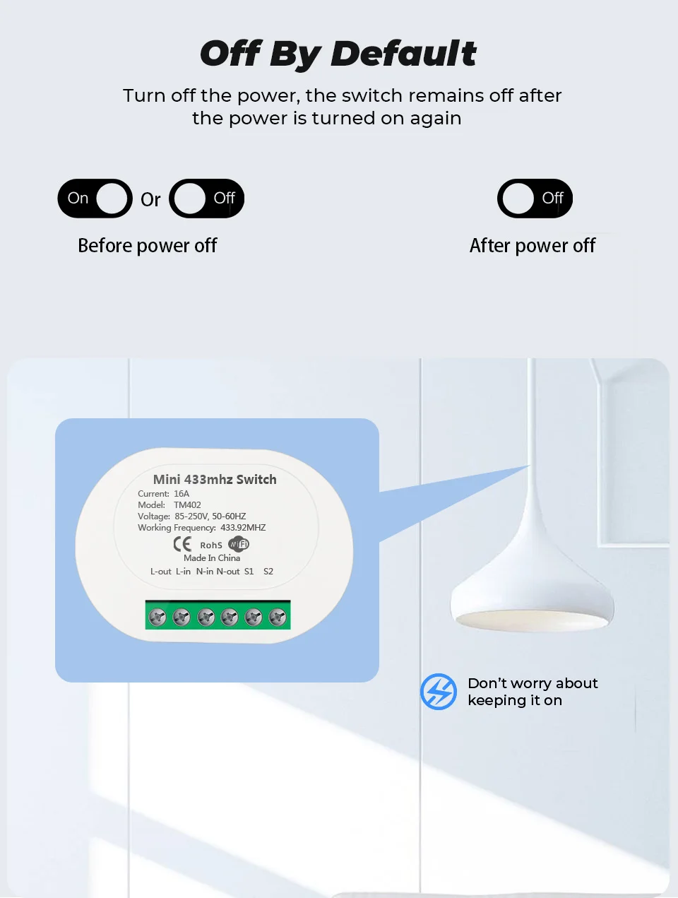 1. Функция синхронизации: не нужно WI-FI или APP, может достигать 4 уровня Функция синхронизации2. 16A Высокая мощность: подходит для большинства устройств, безопаснее в использовании3. Мини-Корпус: может быть непосредственно установлен в нижней коробке переключателя, обслуживание и установка более удобны4. Расстояние открытия 100 метров, более удобное в использовании, фактическое расстояние зависит от препятствий, чем больше препятствий, тем меньше расстояние, тем серьезнее потеря сигнала5. После выключения питания включите снова, состояние по умолчанию выключено6. Поддержка управления 2 способами: Может использоваться с переключателем управления 2 способами перед подключением к дому