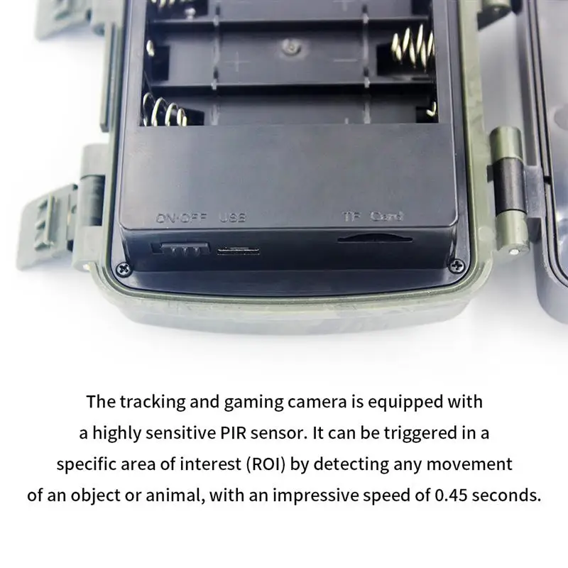 Описание:Эта охотничья камера с PIR датчиком может срабатывать движениями и имеет быструю скорость запуска.Эта Водонепроницаемая камера 1080P может делать четкие изображения и видео со звуком, имеет широкий угол обзора объектива.Эта водонепроницаемая охотничья камера Маленькая и легкая, поэтому вы можете легко носить с собой, когда выходите.Эта камера 12MP trail может делать красочные изображения днем и черно-белые изображения ночью.Эта охотничья камера 1080P подходит для многих случаев, таких как охота, скаутинг, наблюдение за животными, Домашняя безопасность и т. д.Характеристики:Материал: АБС-пластик.Цвет: как на картинке.Датчик изображения: 3MP Цвет CMOS.Разрешение фото: 12 МП 4032*3024.Разрешение видео: FHD 1920*1080P 25FPS.Время срабатывания: 0,8 S.Режим работы: фото, видео, фото + видео.PIR угол: 60 градусов.Угол Линзы: 52 градуса.ИК-светодиодный: 38 шт. 850нм черного света, 15 м.Расстояние PIR: 15 м.Память: Макс TF 32 Гб.Разъем USB: 5 контактов USB 2,0.Источник питания: 4 батарейки типа АА (не входят в комплект) или 5 в постоянного тока.Водонепроницаемость: IP54.Время работы: 8 месяцев.Ток в режиме ожидания: 0,01 мА.Размер: 110x92x55мм.Температура: -10 ~ + 70 ℃/-14 ~ + 158 ℉.Примечание:Из–за разных компьютерных разрешений может быть небольшое цветовое искажение.Возможны незначительные погрешности из-за различных ручных измерений.После завершения установки программы камера изменит файл (time.txt), не влияя на время на фото или видео.Посылка включает в себя:1 охотничья камера.1 руководство пользователя.1 кард-ридер.1 подвесная веревка.Упаковочный лист