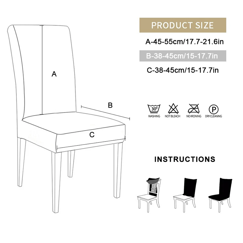 Материал: полиэстерРазмер: Высота спинки 45-55 см, ширина 38-45 см, длина сиденья 38-45 смЦвет: как на картинкеПосылка включает в себя: 1/2/4/6 шт. чехлы для стульевПримечание: Перед заказом измерьте ширину спинки стула и высоту спинки.Особенности:Полиэстер спандекс. Мягкий материал, удобный и устойчивый к морщинкам, не требует глажки.Более плотный трикотаж, более прочныйРастягивающийся материал, растягивающийся, быстро восстанавливается, надежно прилегает к пришитой эластичной кромке.Машинная стирка, легко моется и моетсяПусть ваш старый или уродливый стул будет выглядеть как новый и более красивый. Также может предотвратить царапины и укусы вашего стула.Он используется для отеля, свадебного банкета, ужина, встречи, торжества, церемонии, украшения семейной столовой и т. д.