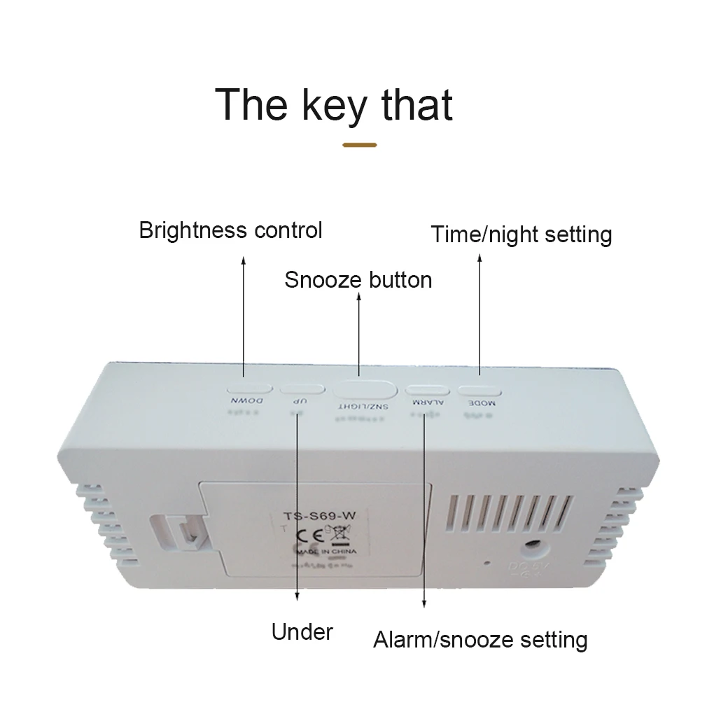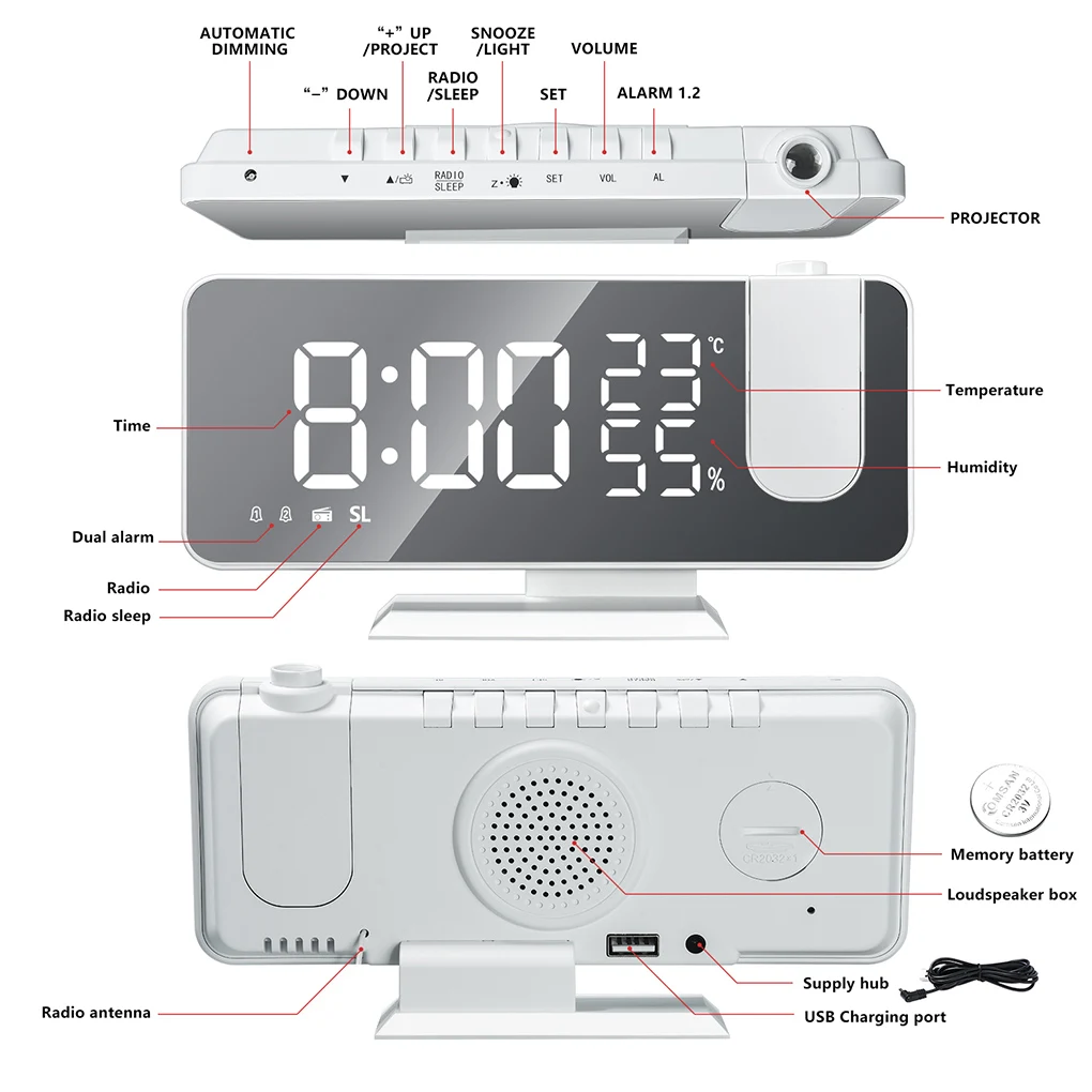 Описание:Этот проектор термометр часы могут измерять температуру и влажность, от 0 ℃ до 50 ℃, от 20% до 95%.Цифровые часы с зеркальной поверхностью могут проецировать время и позволяют регулировать яркость и фокус, а также позволяют вращать его в 180 градусов.Цифровые радиочасы могут отображать температуру и влажность и имеют функцию радио.Цифровые часы температуры и влажности имеют двойные сигналы, имеют зеркальную поверхность и позволяют установить радио в качестве звукового сигнала тревоги.Цифровые часы с регулируемой яркостью, яркость экрана может регулироваться вручную или автоматически.Технические характеристики типа A/B/C:Материал: АБС-пластик.Вход USB: 5 В постоянного тока.Цвет: как на картинке.Размер: 185x45x91мм.Частота: 87,5-108 МГц.Проекционное расстояние: 0,5-5 м.Регулировка громкости: 0-15 уровней.Тип времени: 12 ч/24 ч.Яркость: 4 уровня.Аккумулятор: 1x CR2032 (встроенный)Вход: 5 В постоянного тока