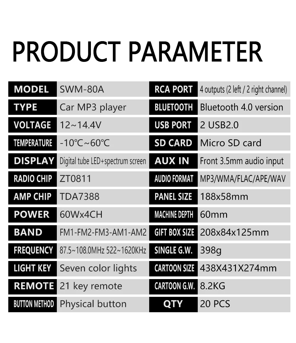 Особенности:ОсобенностиНапряжение: 12 В постоянного токаЧип декодирования: TY3510Тип экрана: дисплей на органических светодиодах (LCD-VAДиапазон радио: FM/AMРадио чип: ZT0811Выходная мощность: 60 ВтРабочая температура:-10 ℃ ~ 60 ℃Название Bluetooth: Автомобильный BTВерсия Bluetooth: 5,0Чип усилителя мощности: TDA7388Радиочастота: FM (87,5 ~ 108 МГц)/AM(522 ~ 1620 кГц)Tf-карта: tf-картаРазноцветными огоньками: ПоддержкаGPS карта: не поддерживаетВерсия USB: 2,0AUX вход: поддержкаБыстрая зарядка: ПоддержкаФункция записи: ПоддержкаИзменение логотипа автомобиля: не поддерживаетсяФормат аудио: MP3/WMA/WAV/FLACКлючевое слово заводской настройки: не поддерживаетсяФормат видео: не поддерживаетФормат изображения: не поддерживаетсяПорт RCA: 4-канальный аудио выходМобильное приложение: вы можете загрузить соответствующее приложение через свой мобильный телефон, чтобы контролировать использование некоторых функций автомобильного проигрывателя;Найти и найти функцию автомобиля: вы можете найти точный и подробный адрес парковки через мобильное приложение;Упаковочный лист1 х Автомобильный стерео приемникПульт ДУ (1 шт.);2 x силовые кабелиРуководство пользователя (1 шт.)Ключ, 2 шт.Пожалуйста, обратите внимание:Установка этого продукта требует профессиональных умений. Если нет, пожалуйста, обратитесь за профессиональной помощью. Подробности см. В инструкции по эксплуатации.Bluetooth: Поиск устройств Bluetooth на вашем телефоне. Сопряжение с устройством, используя пароль «0000».