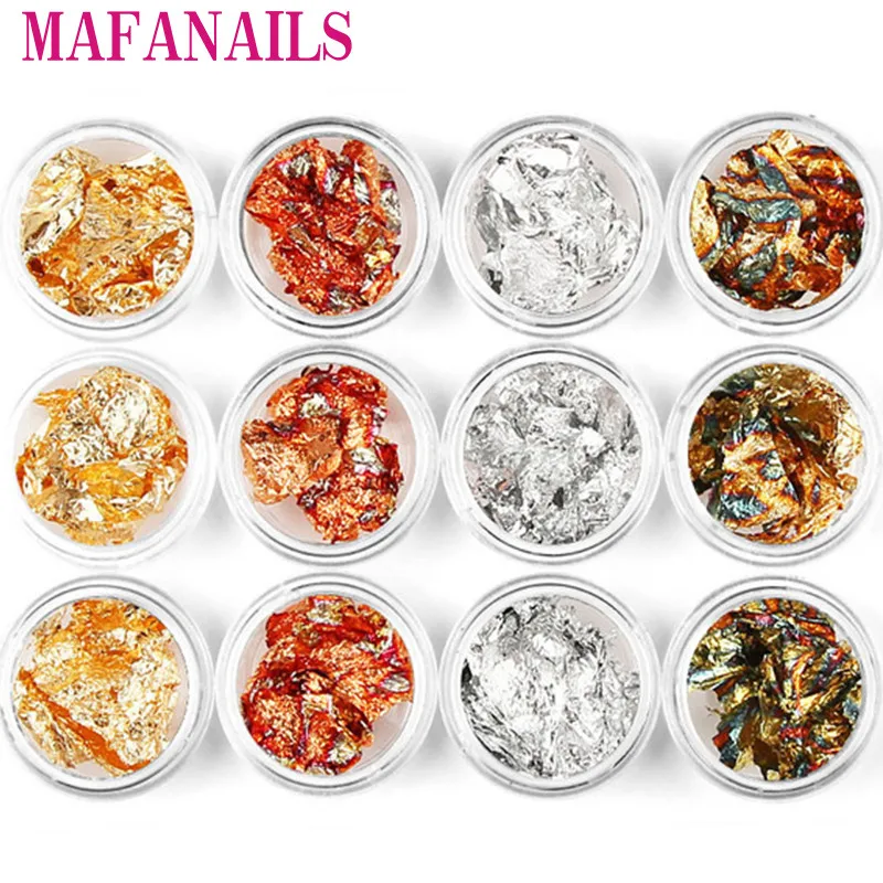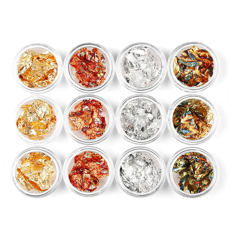 Новинка! 12 банок россыпью блестящие хлопья блестки наклейки для ногтевого дизайна самодельные наклейки для ногтевого дизайна металлические Золотые листья серебряная фольга 12 кор.лот