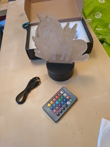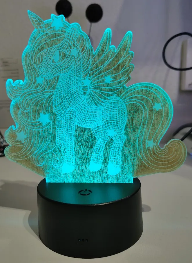 genial, tal y como se ve en la foto. vino bien empaquetado y sin desperfectos. la base de iluminación se adapta perfectamente con la imagen tallada del unicornio.