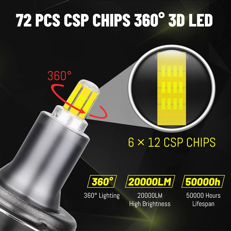 (1)The Led headlight is 20000LM/pair,each bulb is 10000lm ,super bright. (2) One light has 6 sides 72 pcs CSP chips,360 degree lighting. (3) This product is 6500k, pure white light. (4) This product power is 60W/pair, each bulb is 30W.