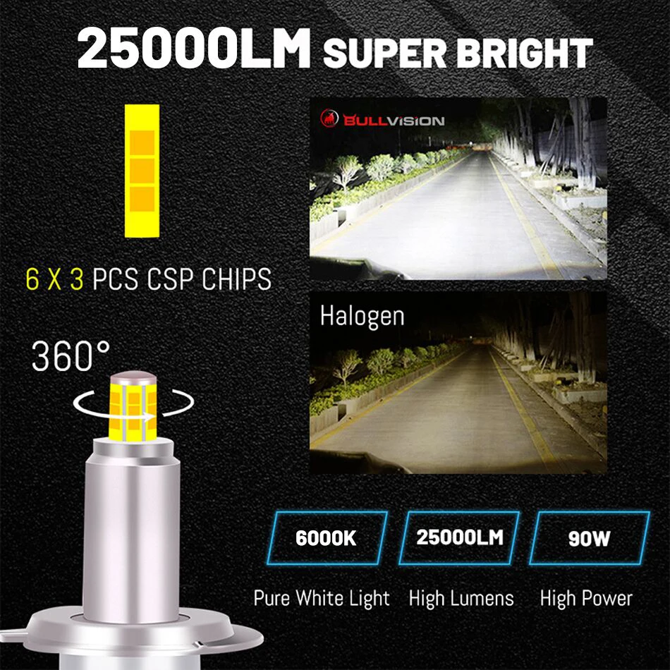 Светодиодные лампы для фар Bullvision H1 25000LM высокой яркости H7 9012 HIR2 H11 9005 9006 HB3 HB4 H8 H9 360 градусов CSP Чип 6000K 90W 12V