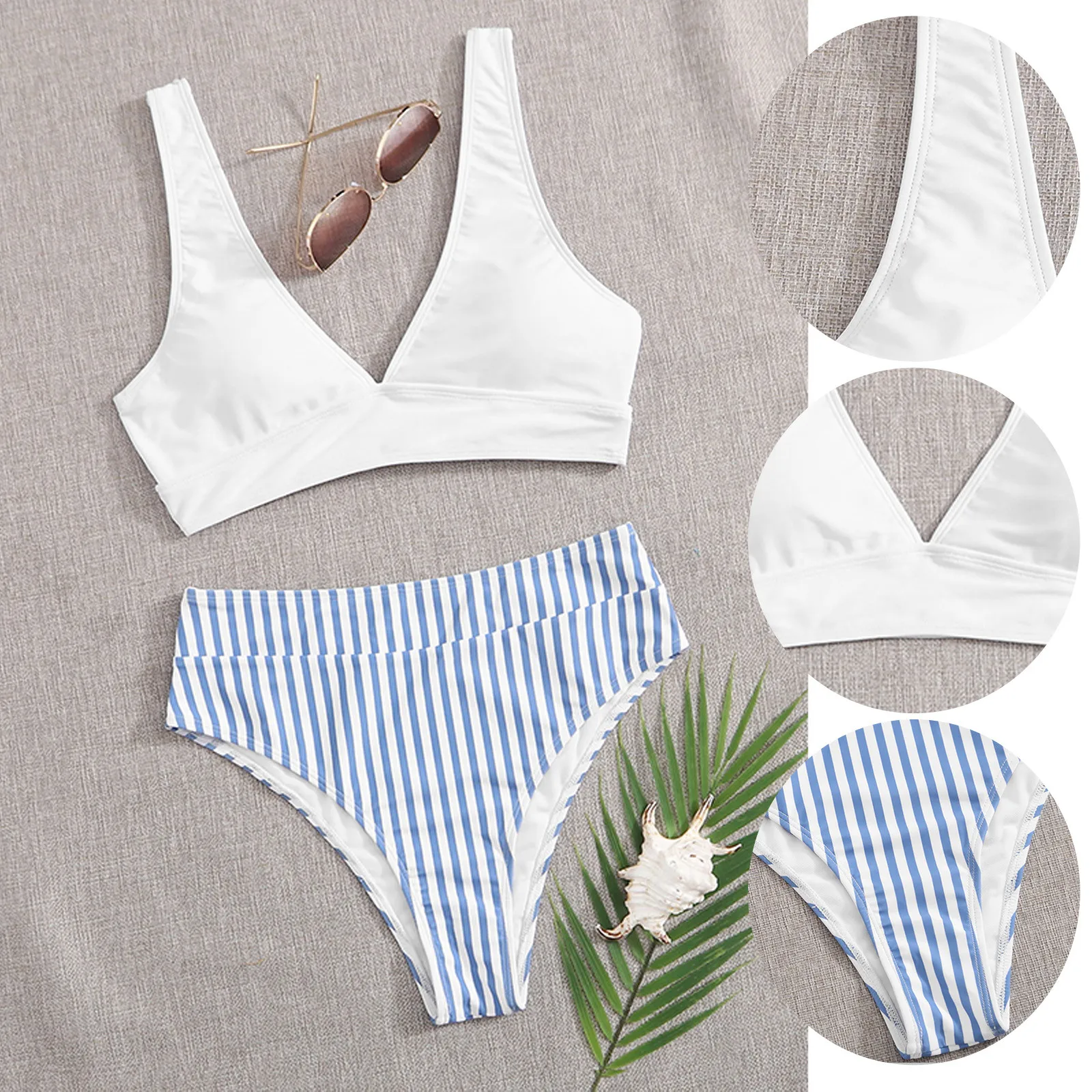 Женское бикини с высокой талией 59 #, пикантный купальник в полоску...
