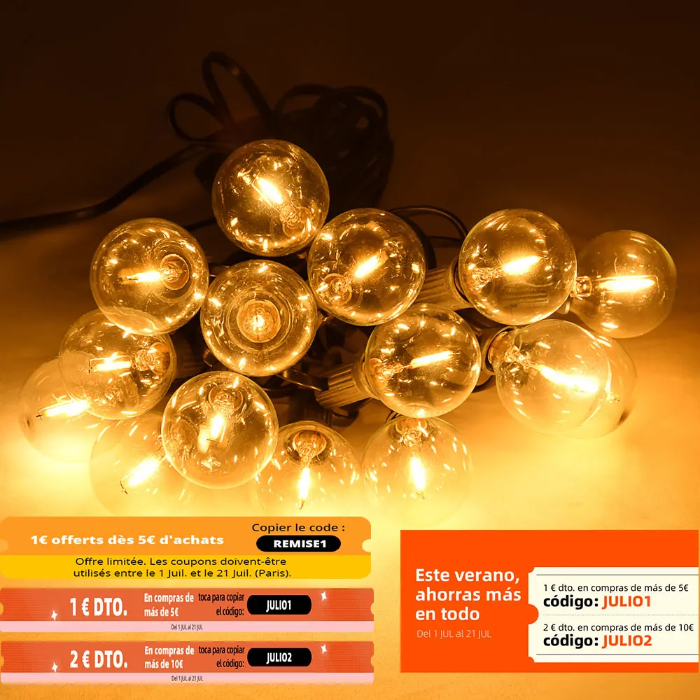 Длина: 24.6ft/7,4 мСветильник; Цвет: теплый белыйМатериал лампы: стеклоФорма: ГлобусНапряжение: 220 ВТип лампы: светодиодныйИспользование: Сад, задний двор, патио, свадьба, вечерние, праздничные, как Рождество, Новый год