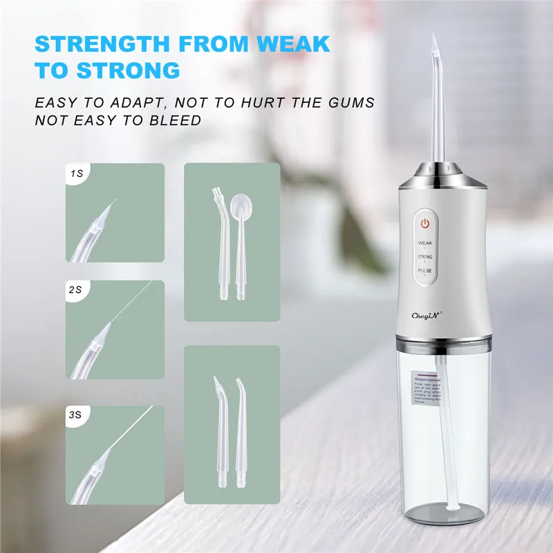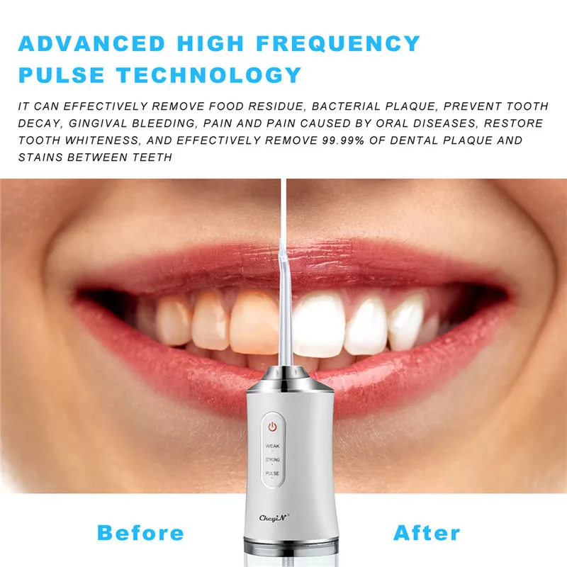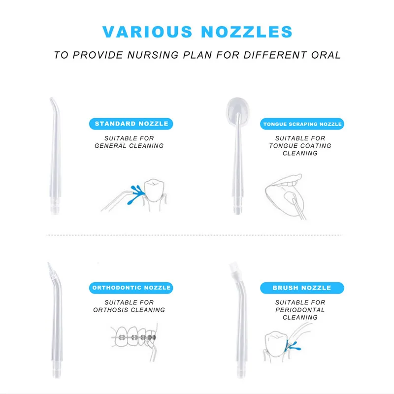 1. 0,6 мм ультра-тонкий поток воды может аккуратно очистите зазор между зубами и мертвые углы полости рта.2. Высокочастотная импульсная технология и интеллектуальный чип точно контролируют давление, так что водяной столб проникает в зубы и легко смывает остатки полости рта.3. Вращающееся на 360 ° сопло, всесторонняя очистка. Сила увеличивается от слабой до сильной, легко адаптируется, не повреждает десны, и не легко кровоточить.4. 3 режима регулировки скорости для удовлетворения различных потребностей в очистке.5. Используйте пищевые материалы, безопасные и безопасные.6. 4 вида насадок, позаботьтесь о всех видах оральных потребностей:Стандартная насадка: подходит для ежедневной чистки зубов;Сопло для соскабливания языка: подходит для ежедневной очистки языка, свежего дыхания;Ортодонтическое сопло: специально для брекетов, Вымойте остатки между брекетами;Пародонтальная насадка: Очистите пародонтал.