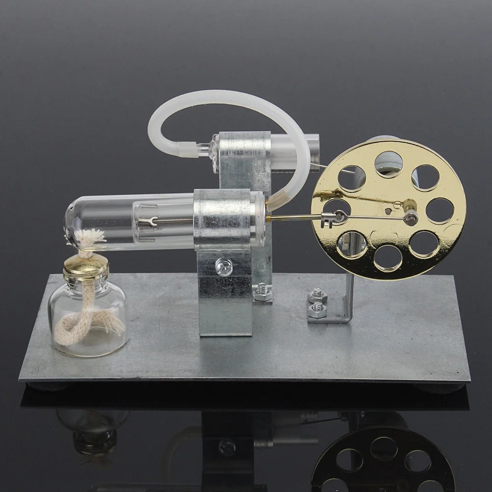 Это двигатель внешнего сгорания, в котором топливо сжигается непрерывно, и поршень перемещается путем расширения воздуха (или гелия или водорода) в качестве среды, И газ расширения охлаждается в холодной камере, и цикл повторяется. Только небольшая спиртовая Лампа, вы можете сделать его быстрым вращением и сильной мощностью.