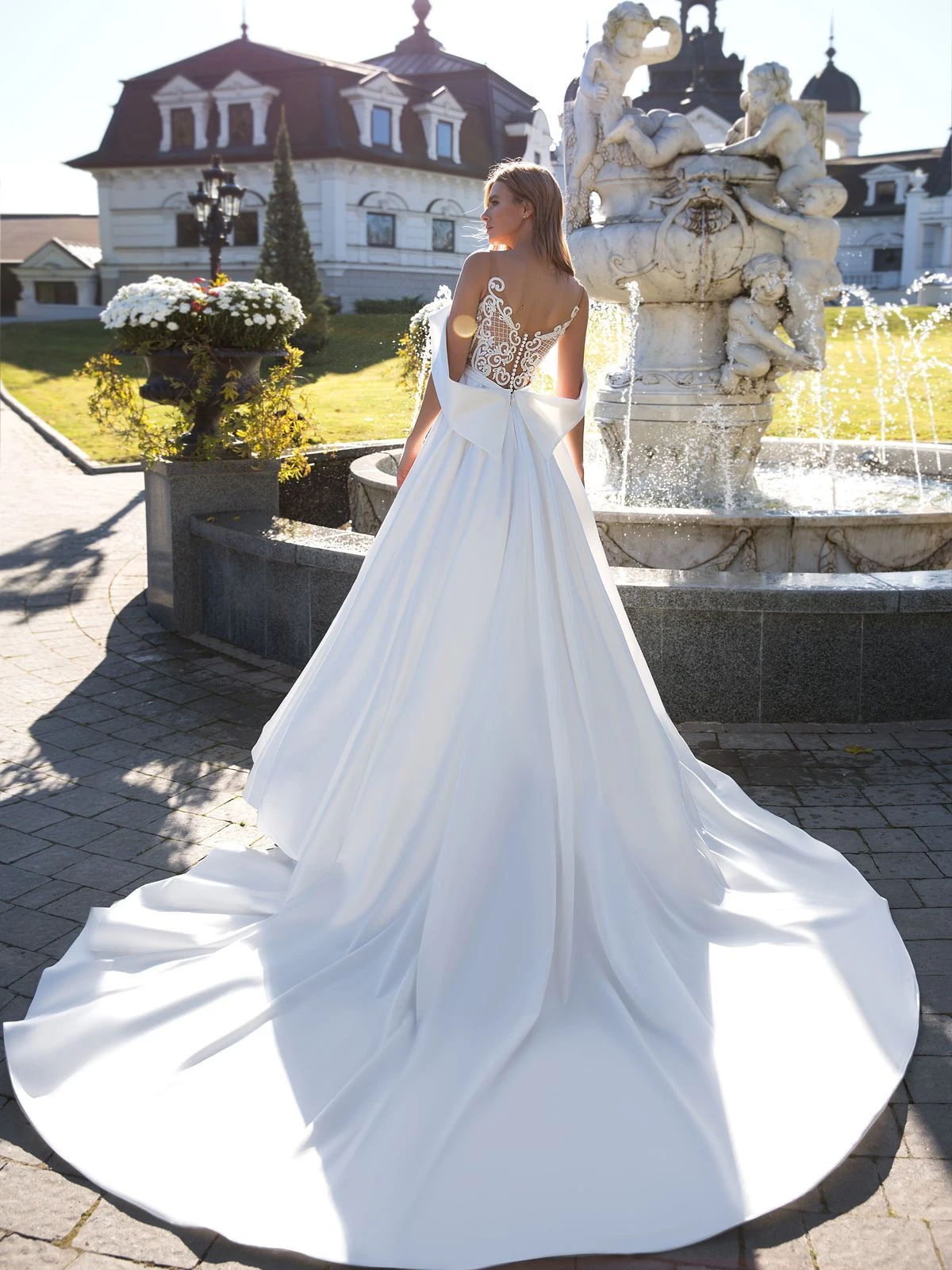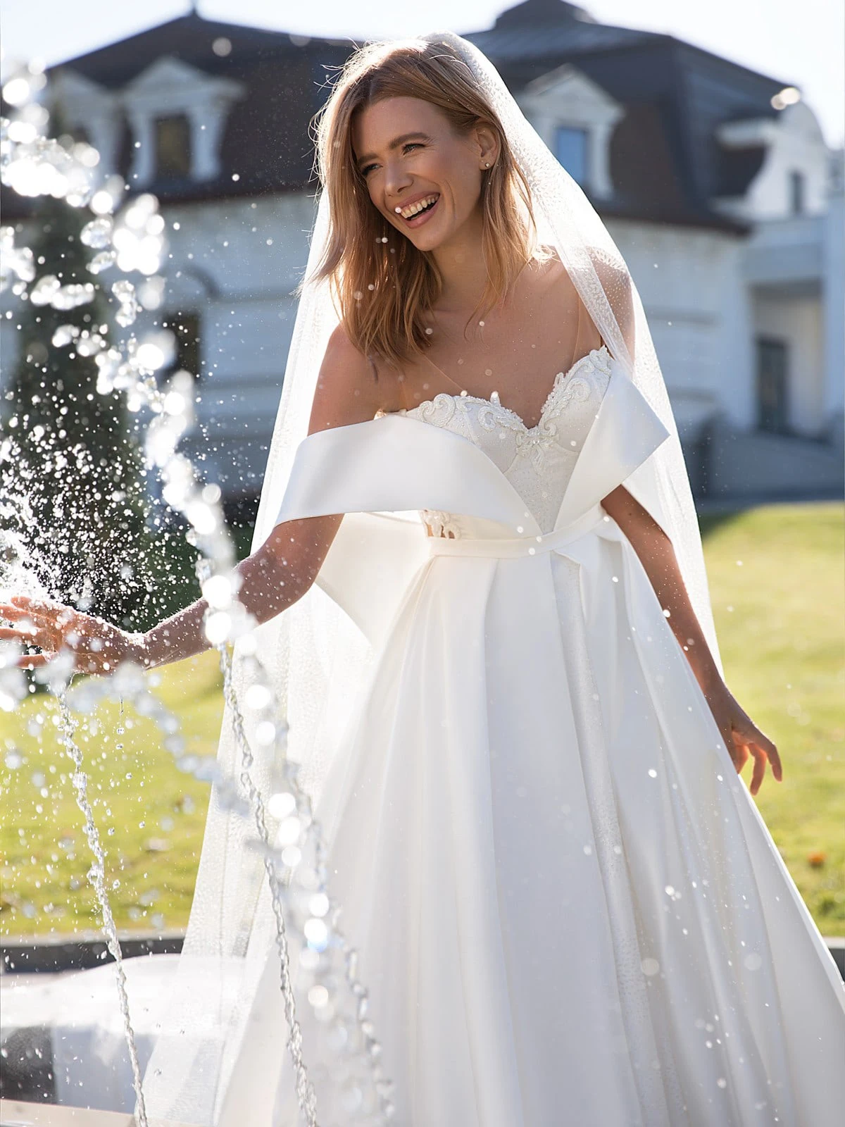 Иллюзия с открытыми плечами из сатина; Элегантные свадебные туфли; Обувь под свадебное платье для невесты с прозрачным кружевом кнопки 2021 размера плюс, платье принцессы Свадебное платье с низким вырезом на спине и поезда