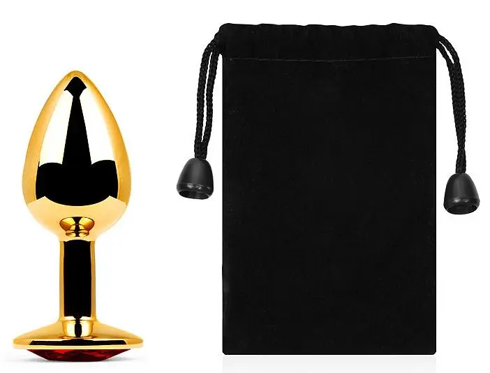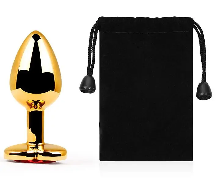 Золотая анальная пробка из алюминия размер S. Страз в основании круглой формы, выполнен из стекла светло-фиолетового цвета. Упакована в вельветовый мешочек для хранения.