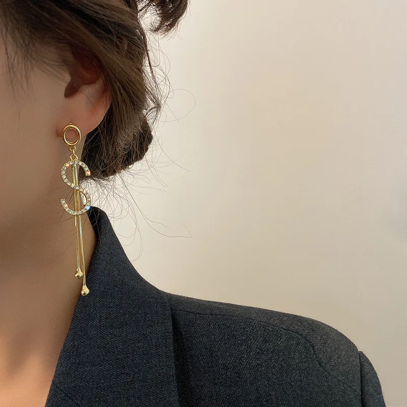 Роскошные серьги-гвоздики с буквой S, с кисточками, с имитацией жем...