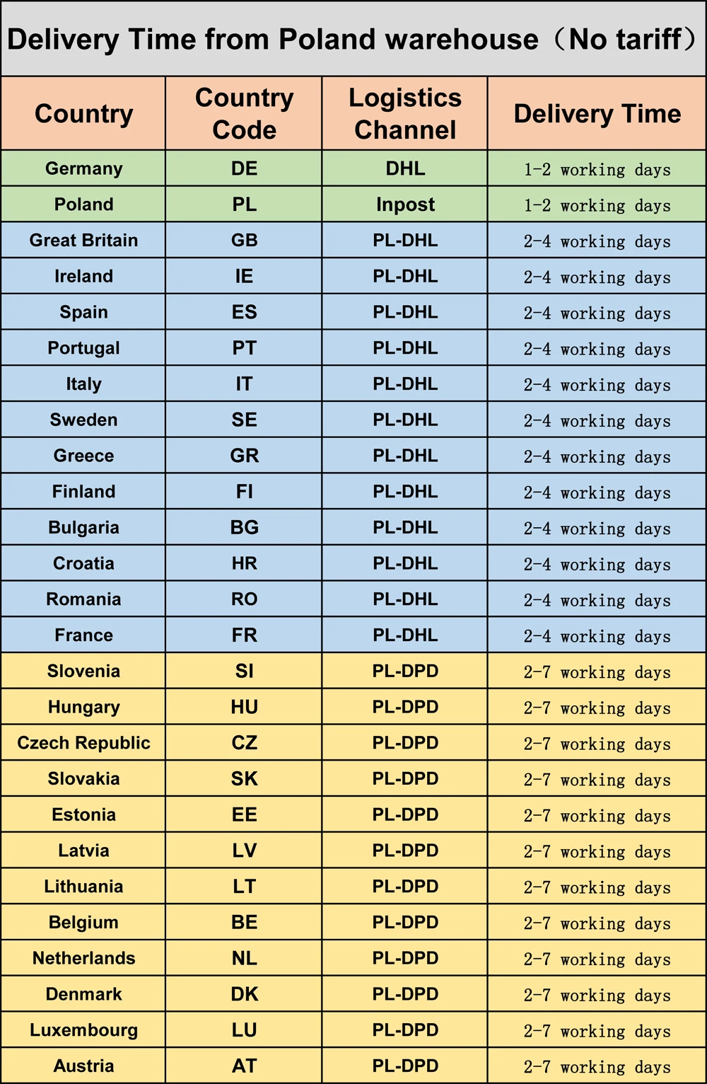 1. Если ваш адрес принадлежит этой области, его можно отправить только из Китая через DHL. Испания Почтовый индекс: 35000-35999/38000-38999/51000-51999/52000-52999. Португалия Почтовый индекс: 9000-9999 2. Доставка склада в Польшу в страны ЕС, отправка через UPS или DHL, обычно 3-8 дней. 3. Доставка российских складов в 1,2,3,4 район, как правило, 3-12 дней.