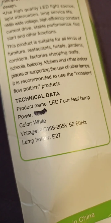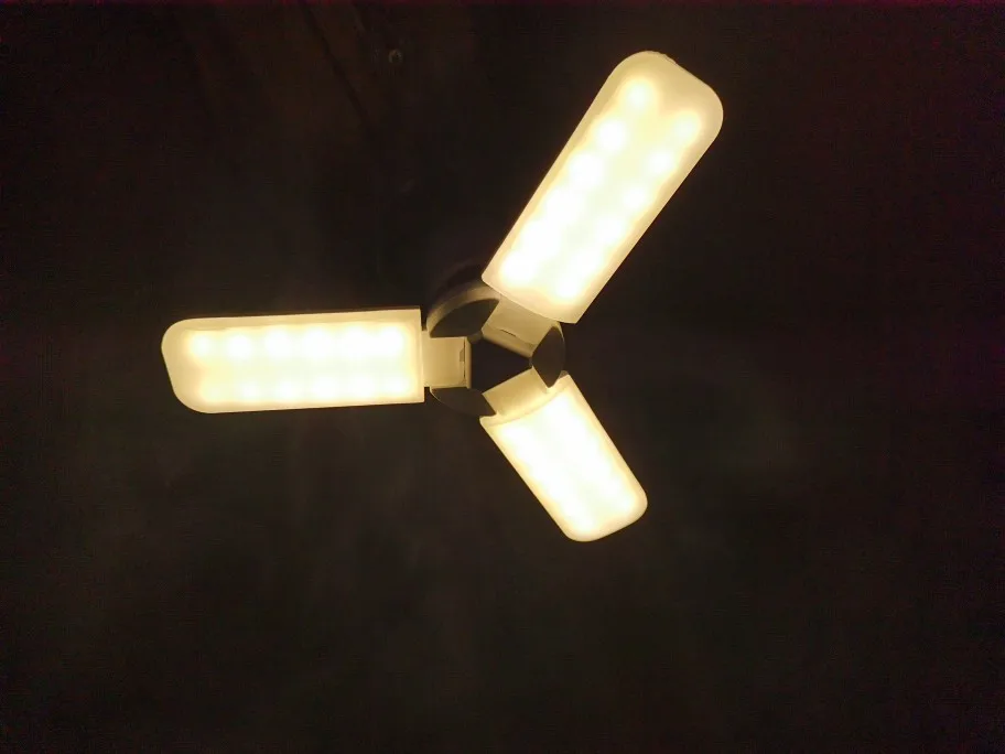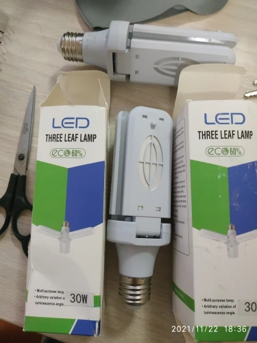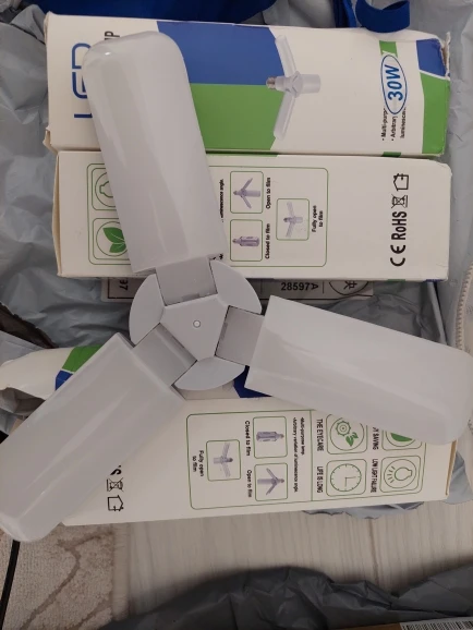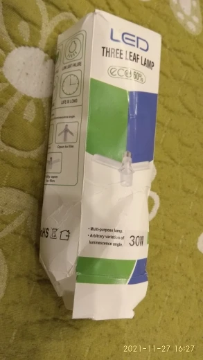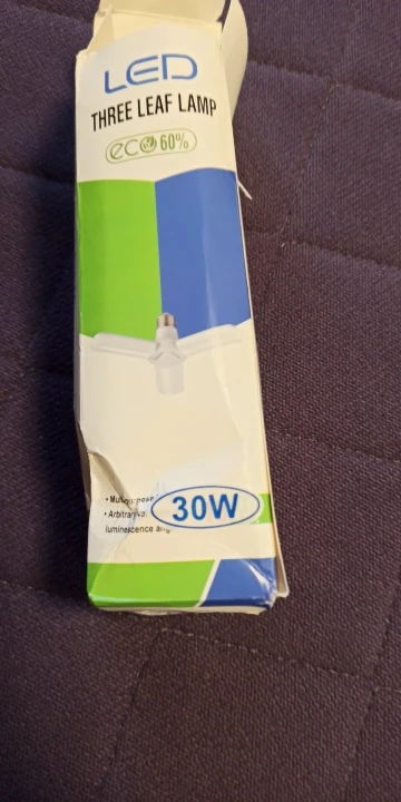 Лампа светодиодная 30 ват. Светит не плохо. Лопасти с обратной стороны нагреваются, что очень странно для светодиодов. Возможно так и должно быть. Просьба к продавцу : посылку упаковывать более качественно. Коробочка очень сильно измята. Мне повезло лампа не пострадала.