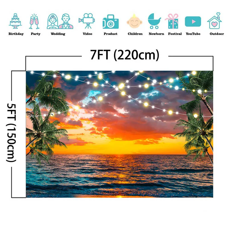 Фон для фотосъемки с изображением летнего заката, тропического побережья, пляжа, деревьев