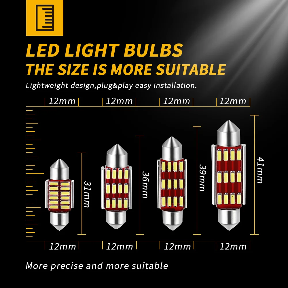 -Модель чипа: 4014-Количество чипов: 12 шт.-Цвет: белый-Тип разъема: C5W гирлянда 31 мм/C5W гирлянда 36 мм/C5W гирлянда 39 мм/C5W гирлянда 41 мм-Напряжение: 12 В-Мощность: 1,5 Вт/шт.-Световой поток: 900лм-Срок службы: 30000 часов-Материал: алюминий-Вес: 4 г/шт.