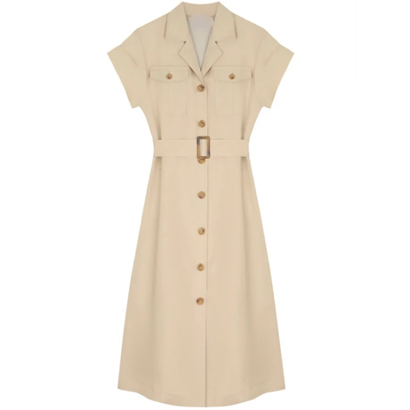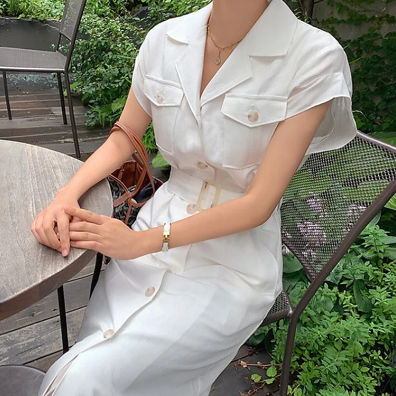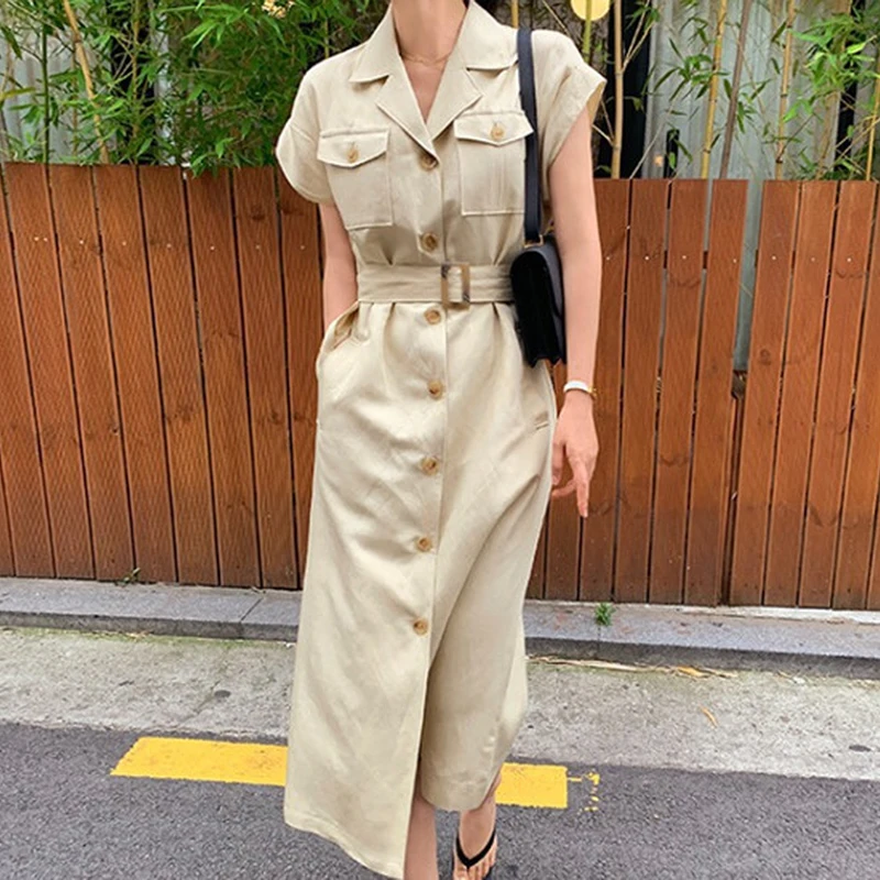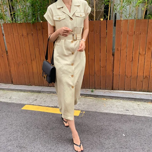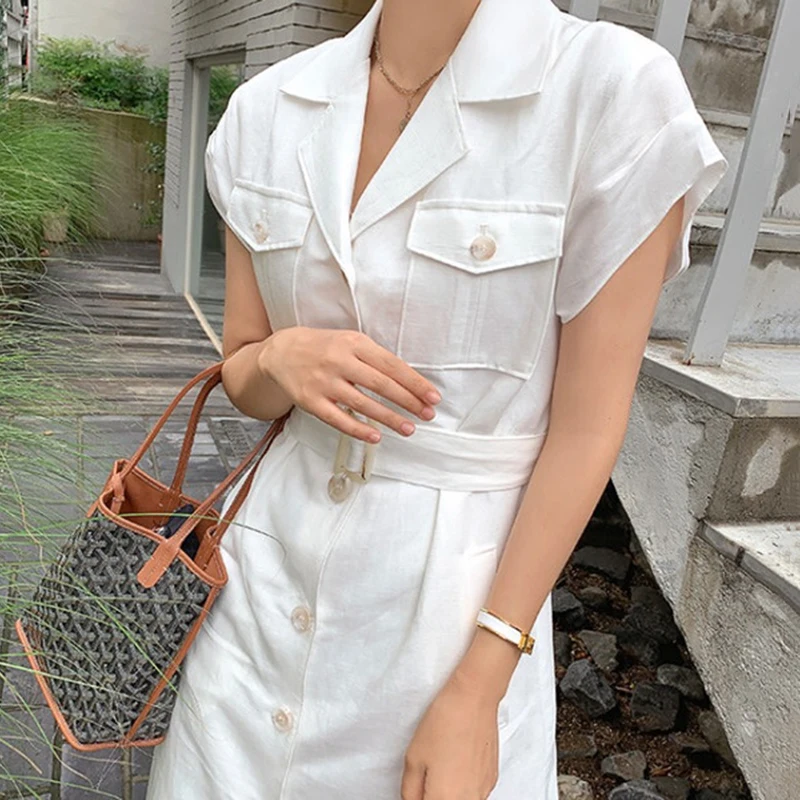 Женское платье в Корейском стиле, элегантное платье в стиле ретро с отложным воротником и множеством карманов, платье с пряжкой и коротким рукавом и поясом, лето 2021