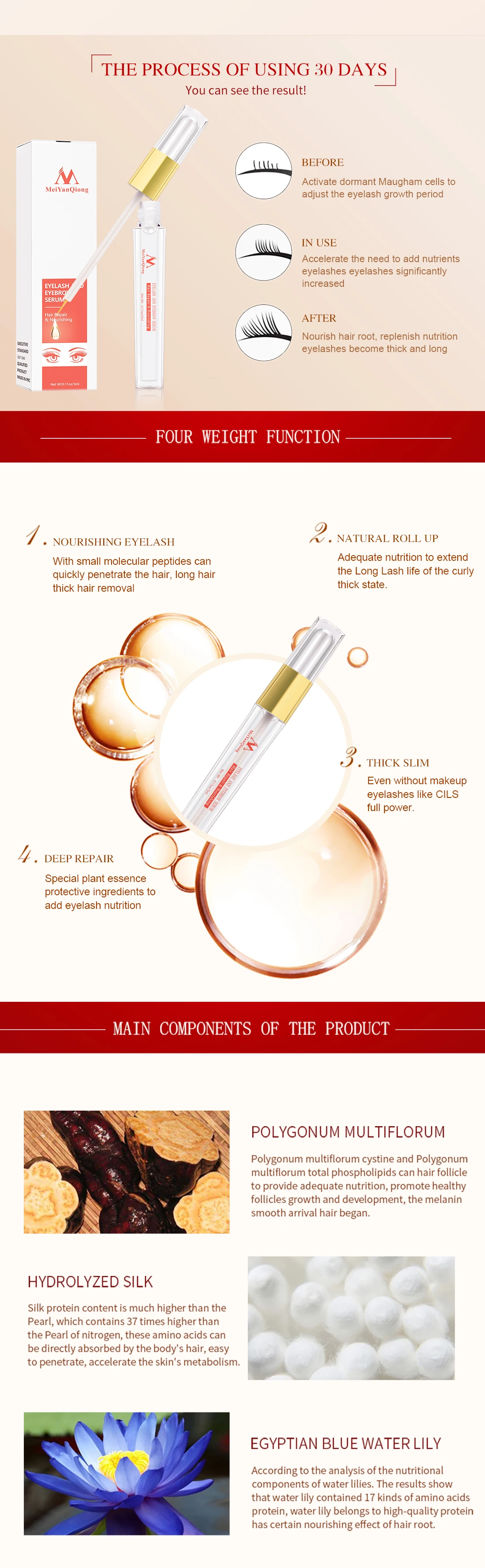 1. Питательные ресницыС небольшими молекулярными пептидами могут быстро проникать в волосы, длинные волосыУдаление густых волос2. Естественное сворачиваниеДостаточный nutitin, чтобы продлить долгий срок службы вьющихся толстых состояний.3. Толстый ТонкийДаже без макияжа ресницы, такие как CILS full power.4. Глубокий ремонтСпециальные растительные эссенции защитные ингредиенты, чтобы добавить питание ресниц