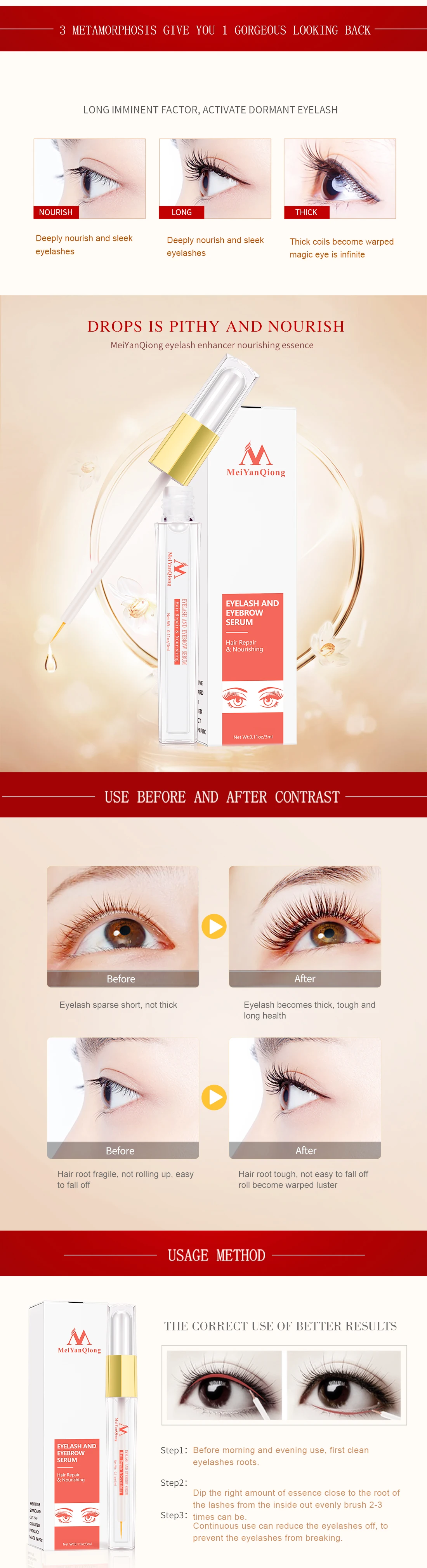 Правильное использование лучших результатовШаг 1: перед утренним и вечерним использованием сначала цеан корни ресниц.Шаг 2: окуните нужное количество эссенции близко к корню ресниц с внутренней стороны равномерно расчесывайте 2-3 раза.Шаг 3: Непрерывное использование может уменьшить ресницы, чтобы предотвратить поломки ресниц.