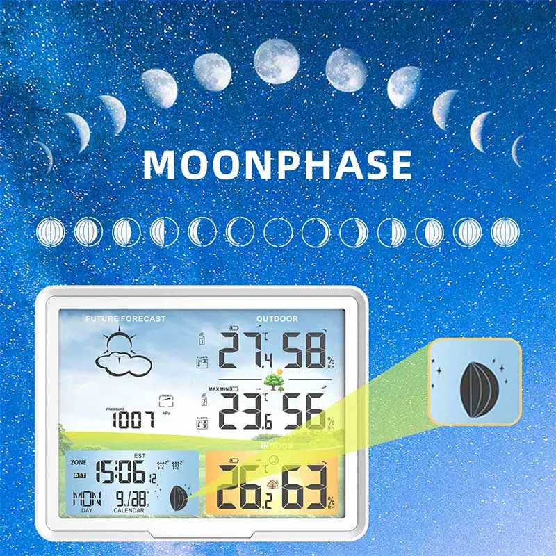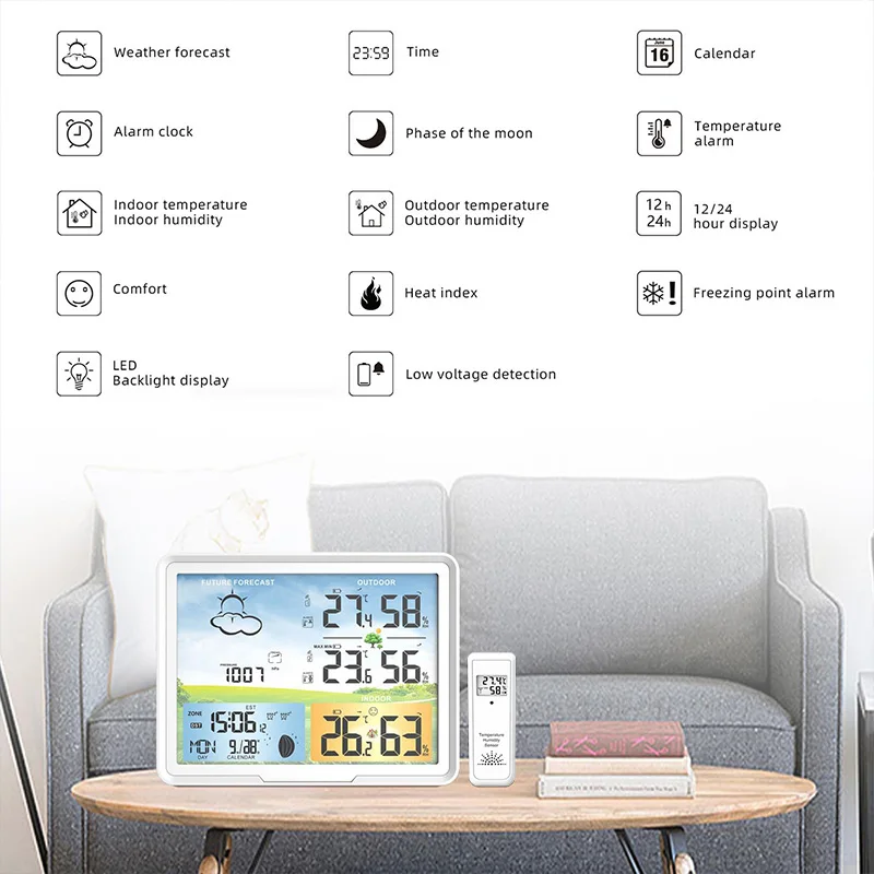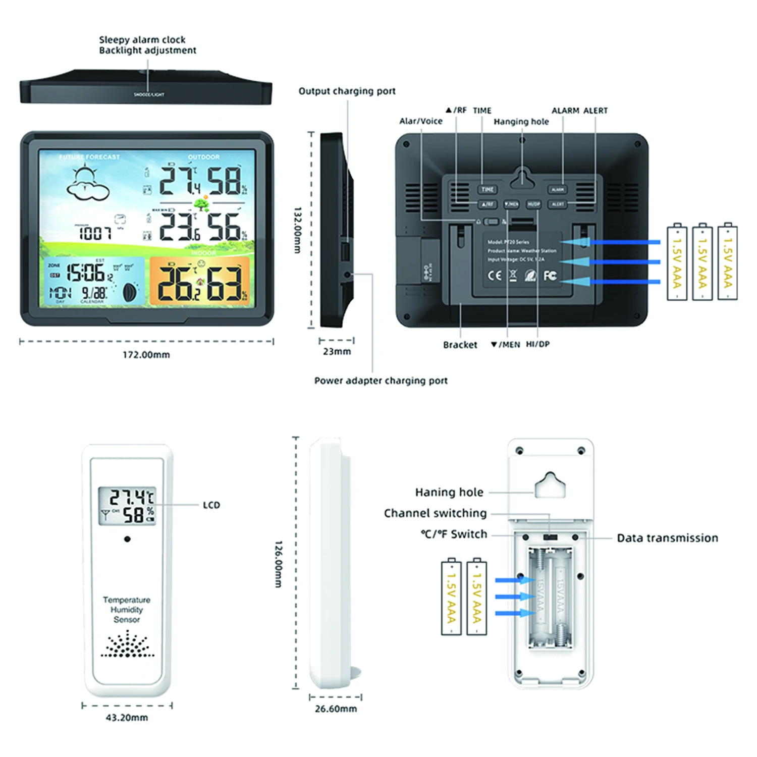 ▲ Календарь.▲ 7 языков для отображения в будний день: английский, немецкий, итальянский, французский, испанский, голландский и датский.▲ Персонализированный будильник, можно установить для звонка каждый день или только в будни/выходные дни.▲ Фаза Луны и прогноз погоды.▲ Измерение температуры, влажности и давления воздуха (поддерживаются ℃ и ℉) (погрешность температуры ± 1 ℃ и погрешность влажности ± 5% являются нормальными.)▲ Запись минимальной и максимальной температуры и влажности.▲ Индекс температуры и тепла точки росы.▲ Оповещение о морозе и температуре.▲ Уровень комфорта в помещении.▲ Метеостанция PT20A может подключать до 3 удаленных датчиков одновременно, и данные каждого датчика будут автоматически циклироваться на экране метеостанции. Если у вас только 1 удаленный датчик, установите метеостанцию и удаленный датчик на одном канале. Рекомендуется использовать канал 1.Примечание: В посылка входит только 1 датчик дистанционного управления PT20A.▲ Напоминание о низком заряде батареи▲ Светодиодная подсветка экрана▲ Источник питания.Для хоста метеостанции: USB, который можно использовать в любой стране (не включает зарядную головку) или аккумулятор (3 × 1,5 В AAA (LR 03)Для удаленного датчика: 2 × 1,5 В AAA (LR 03)Примечание: батарейки в посылка входят.▲ Если данные наружного датчика не передаются на метеостанцию, нажмите и удерживайте кнопку «▲/RF», чтобы очистить данные канала, тогда он автоматически обнаружит и передаст данные.