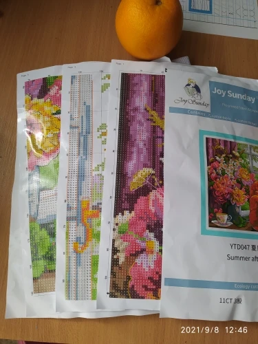 Доставка заняла больше времени, чем указано, немного задержалась посылка. Схемы хорошие, на отдельных листах, в наборе много ниток и две иголочки. Всё понравилось, будем вышивать) Спасибо.