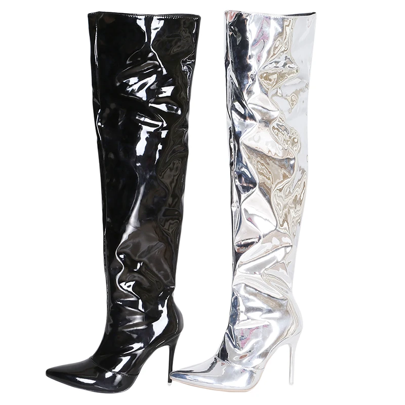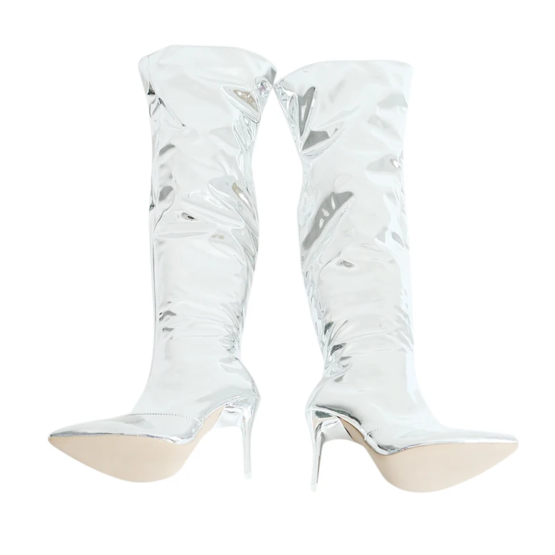 Женские Серебристые высокие сапоги до бедра, с острым носком, на тонком высоком каблуке