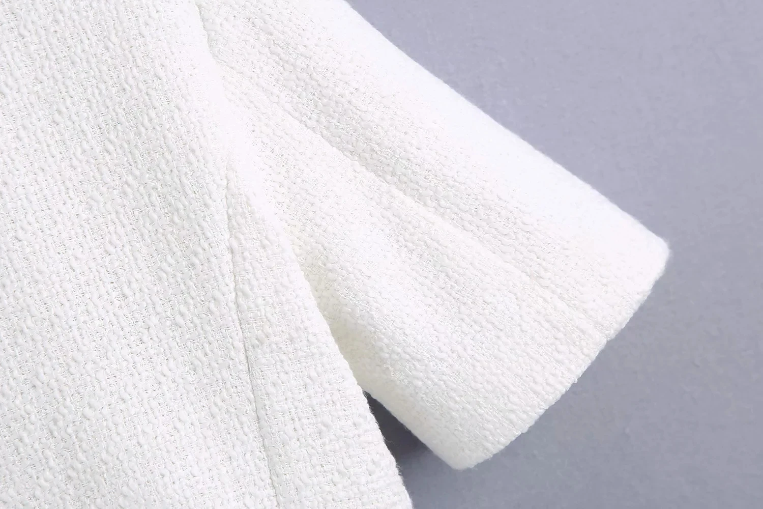 Укороченный пиджак с воротником с лацканами и короткими рукавами. Передние накладные карманы. Подходящая подкладка. Застежка спереди с металлическими текстурированными пуговицами.