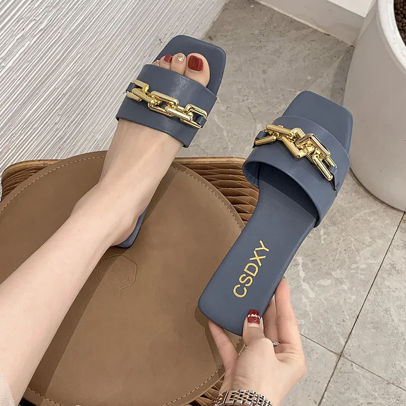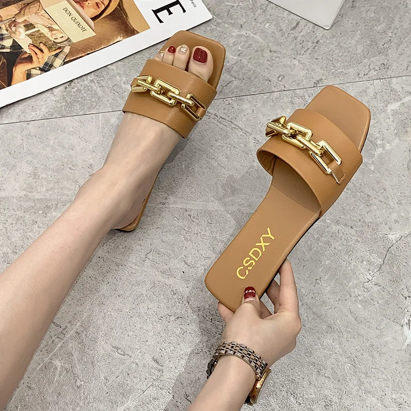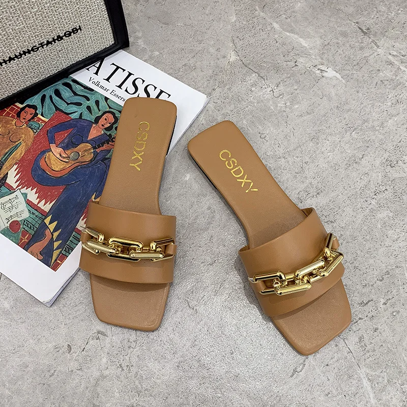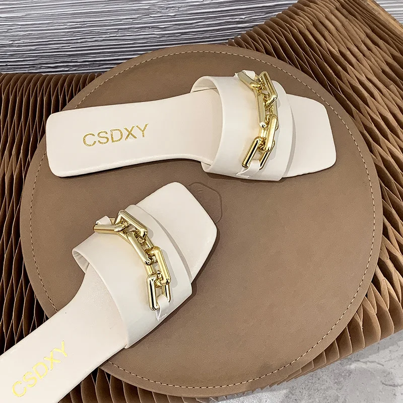 Размера плюс летние женские шлепанцы, шлепанцы на плоской подошве с металлической цепочкой, женские шлепанцы с квадратным носком, женские пляжные шлепанцы, женская обувь