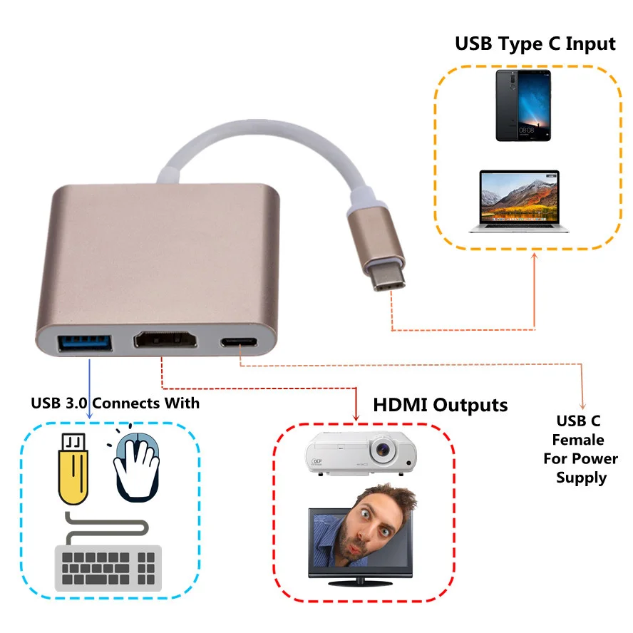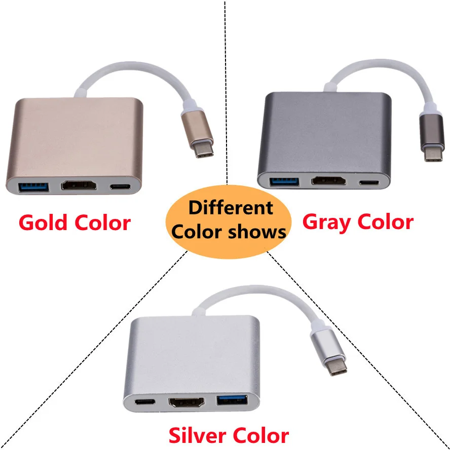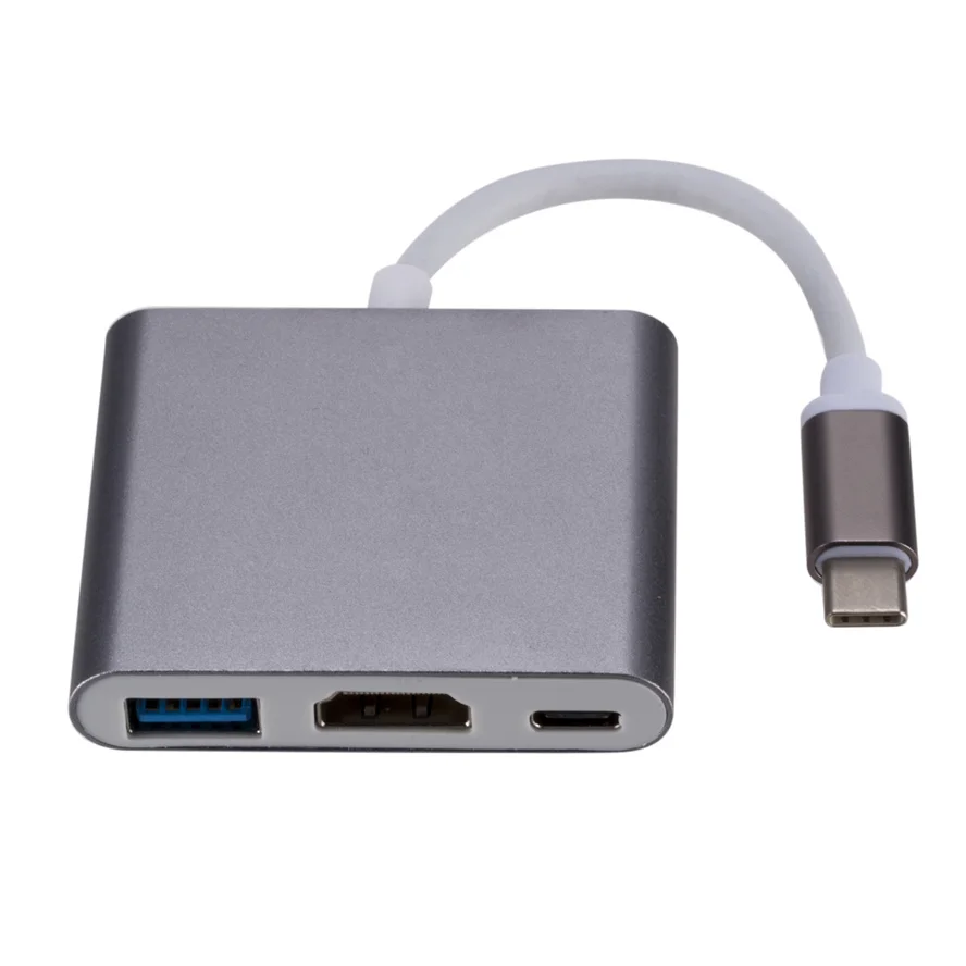 Зарядный порт Type-C для USB 3,0/HDMI / Type C. Характеристики: Сторона 1 (вход): USB 3.1 Type C Male Сторона 2-1 (выход): Тип C женский Сторона 2-2 (выход): HDMI Женский Сторона 2-3 (выход): USB 3,0 Female Кабель: Тройной экранированный Длина: прибл. 15 см Цвет: серый, серебристый, золотой Посылка: полиэтиленовый пакет Сторона 1 (вход): USB 3.1 Type C Male Сторона 2-1 (выход): гнездо типа C-зарядка для хост-компьютера Сторона 2-2 (выход): HDMI Female - HDMI port (DP Alt mode) позволяет подключить дополнительный монитор, чтобы вы могли смотреть видео или слайд-шоу на большом экране. Он может работать для Macbook для Pixel и других поддерживаемых устройств Type-C. Сторона 2-3 (выход): USB 3,0 Female-позволяет подключать usb-устройство к хост-компьютеру или другому концентратору Посылка: 1 * usb c к hdmi 3 в 1 конвертер