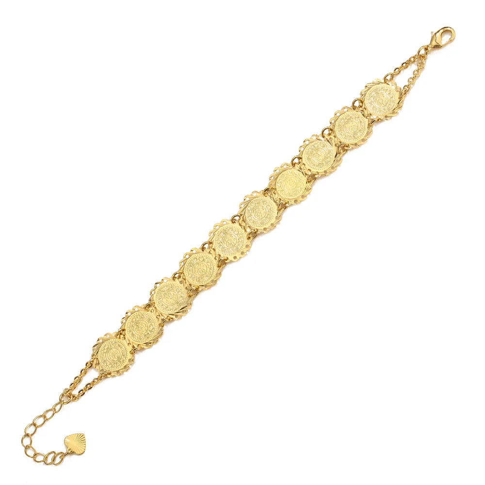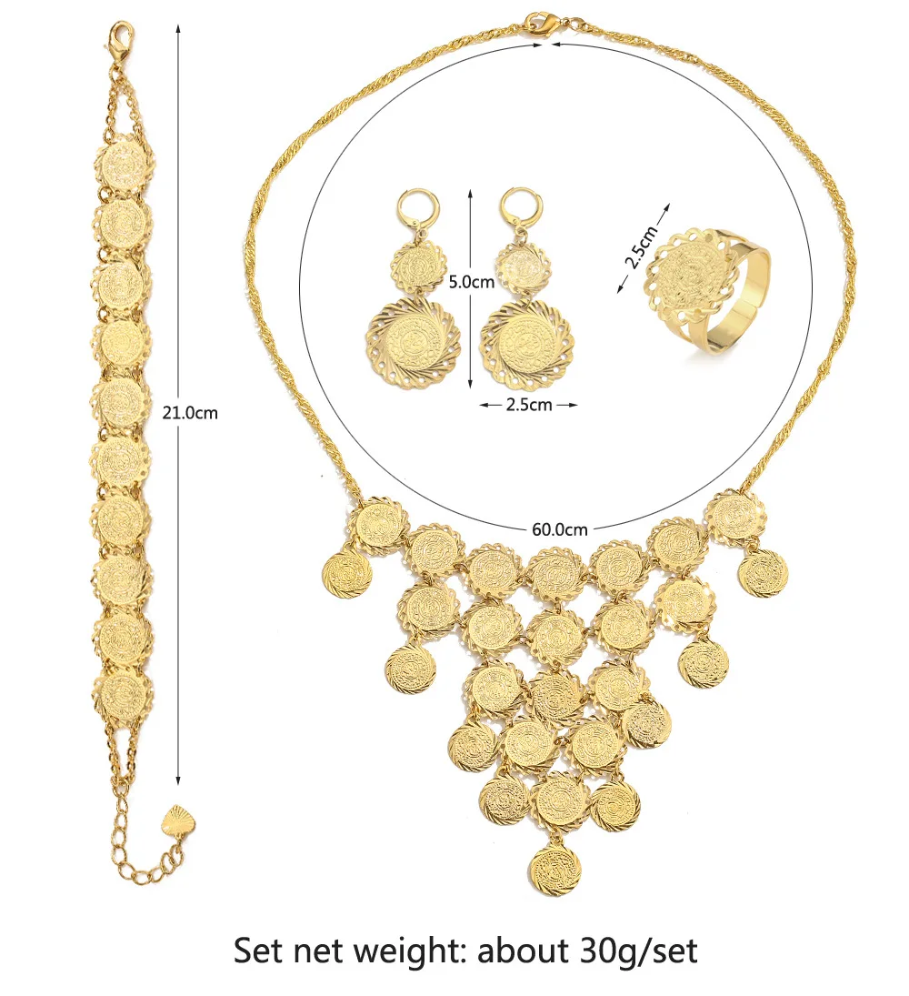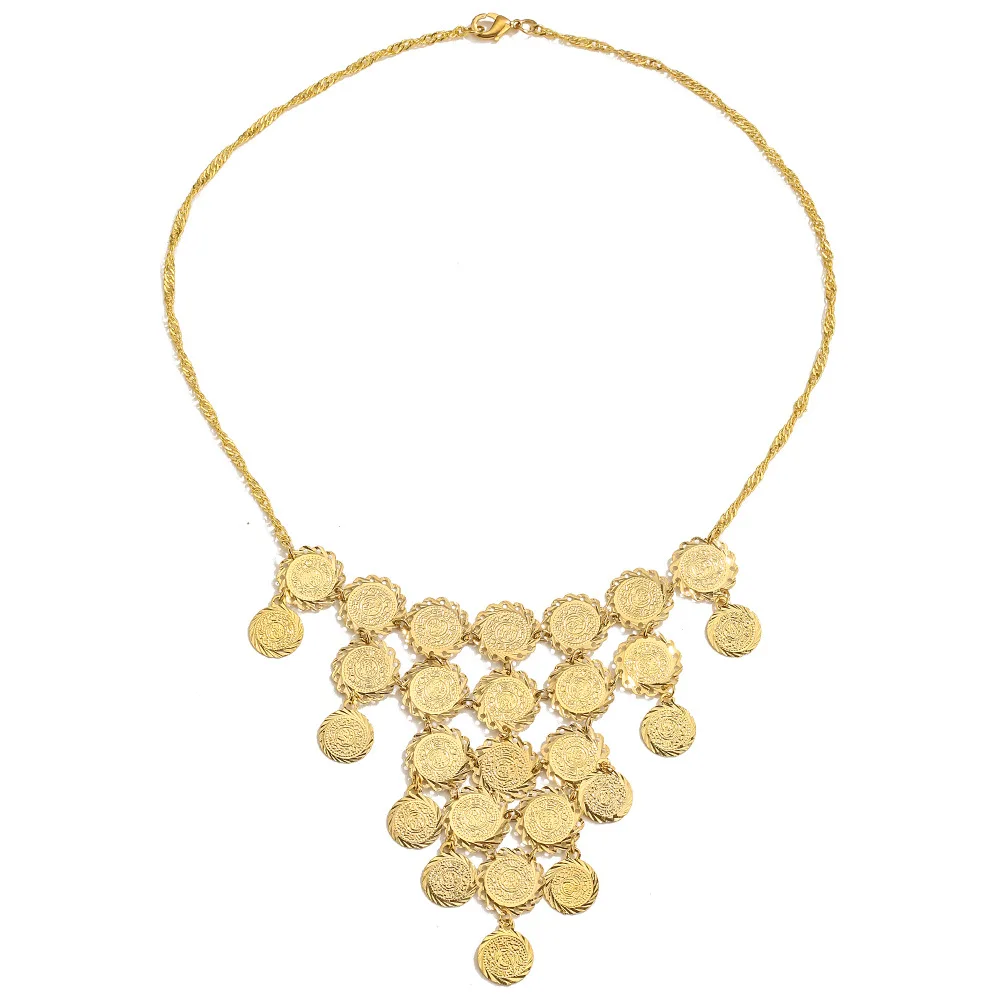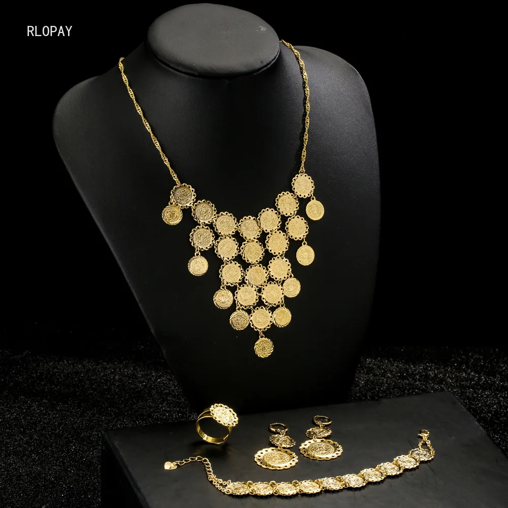 Ближнего Востока арабского аксессуары 4 шт. Neckle набор, браслет, кольцо серьги Медь с золотым покрытием в этническом стиле свадебный комплект ювелирных изделий