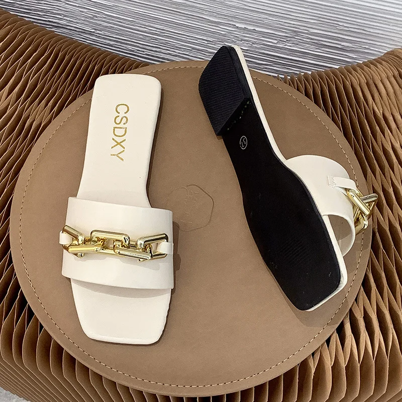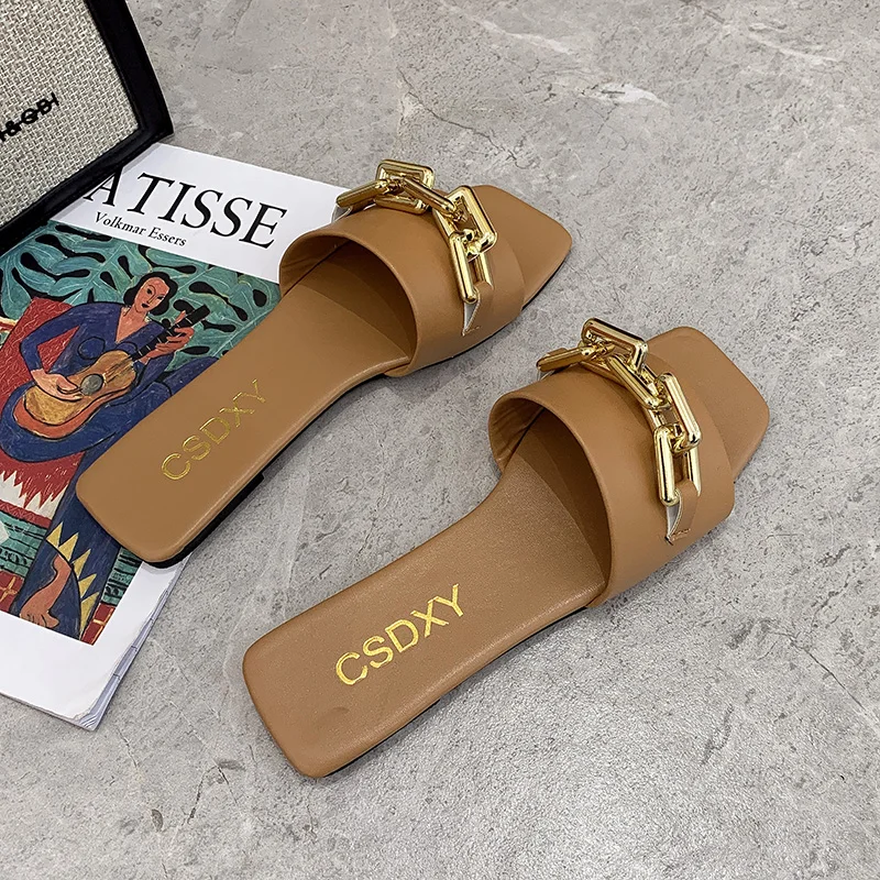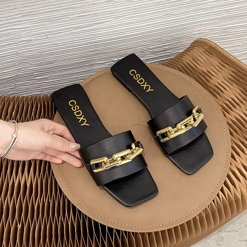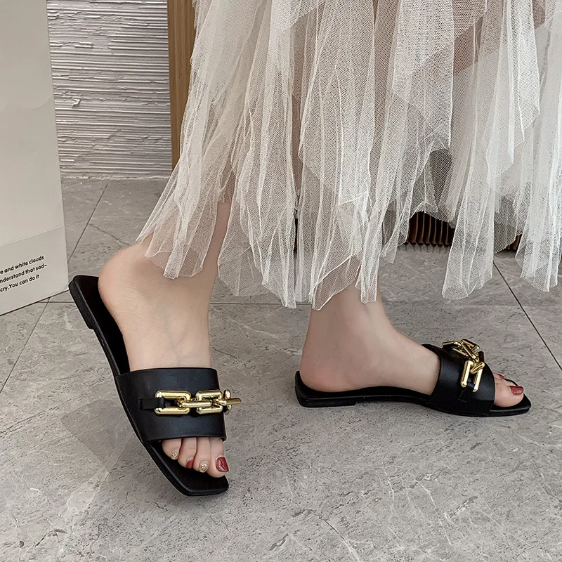 Размера плюс; Женские шлепанцы; Сезон лето; Обувь на плоской подошве с металлическими цепочками; Женские шлепанцы без задника с открытыми пальцами квадратный носок женские шлепанцы; Пляжные шлепанцы на плоской подошве, без шнуровки; Женские туфли