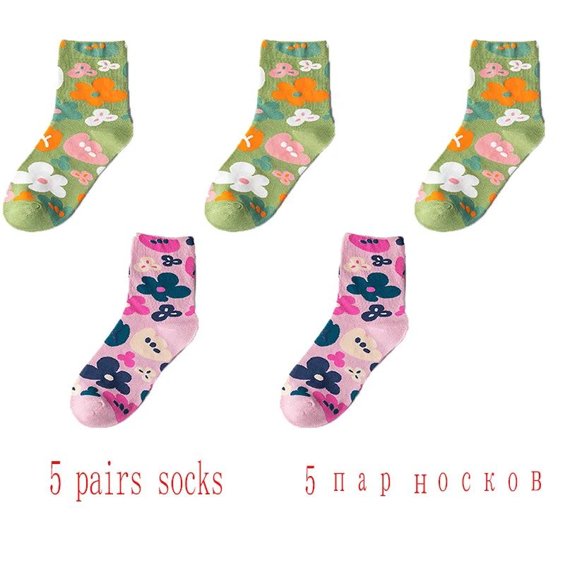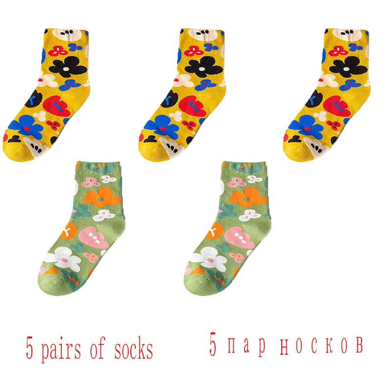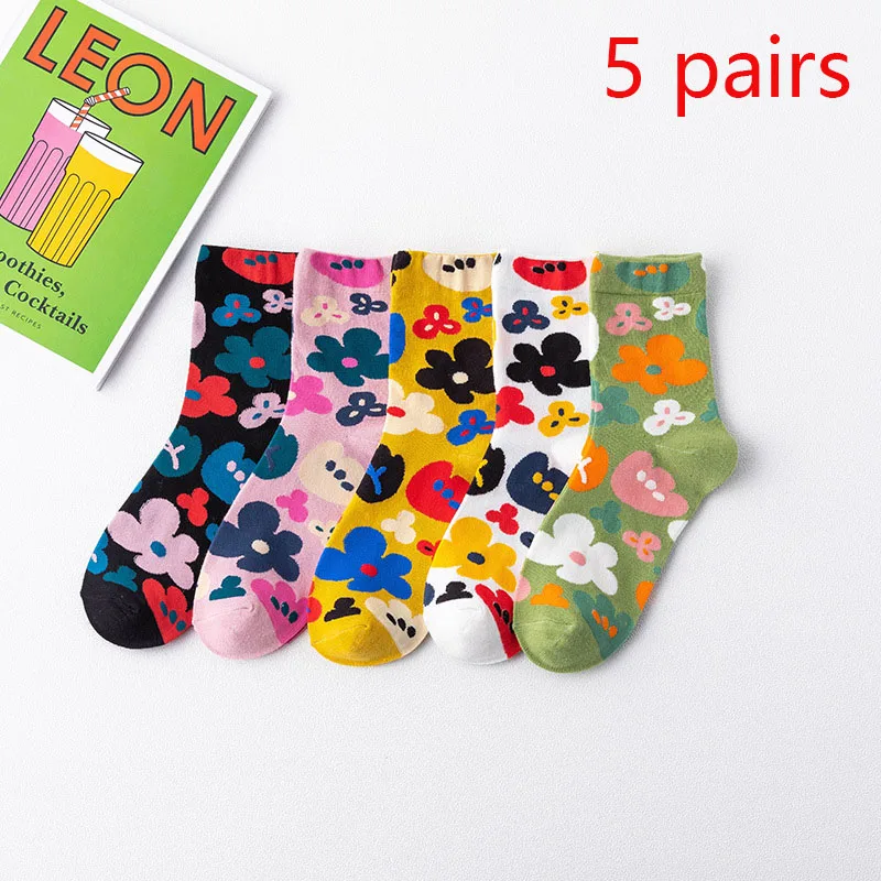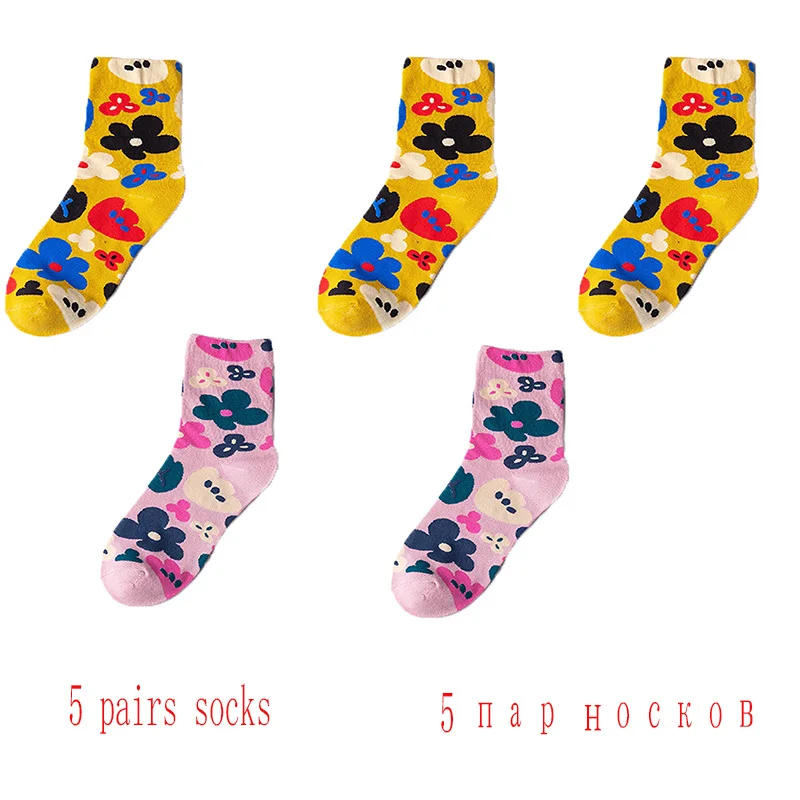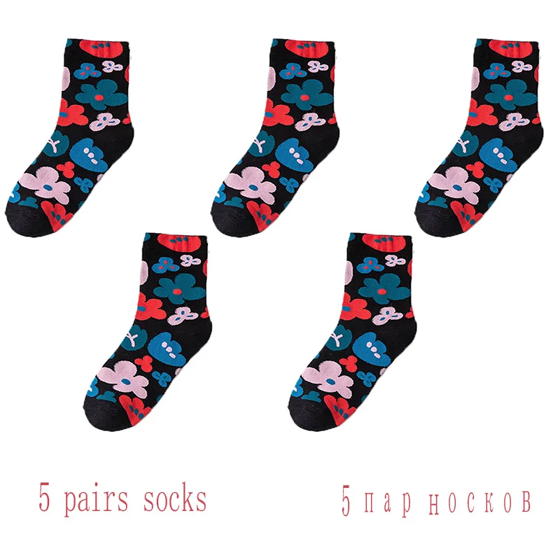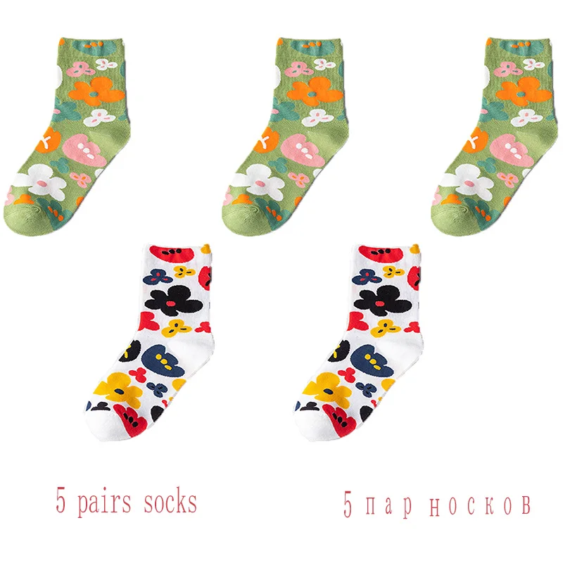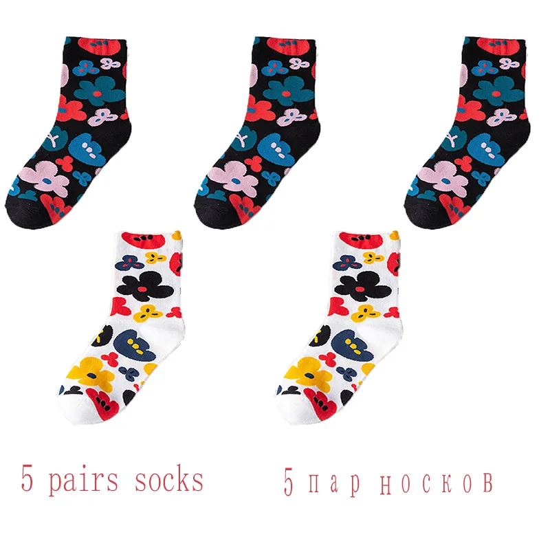 5 пар в партии, Забавный; С цветочным принтом; Хлопковые женские нескользящих носочков, высокое качество, на каждый день, в стиле Харадзюку для девочек Симпатичные носки для женщин, подарки набор