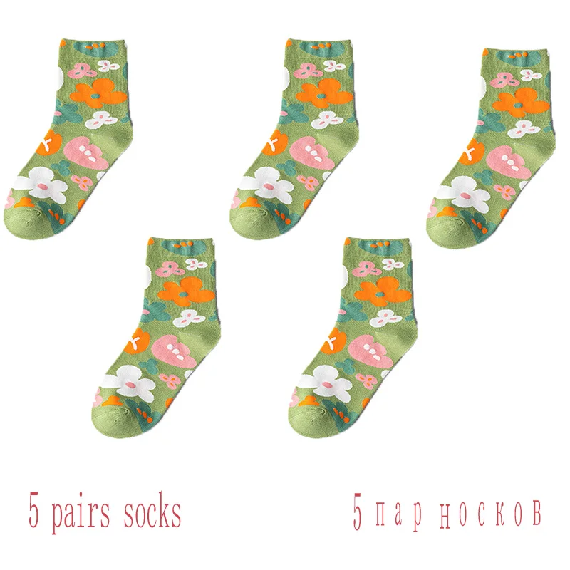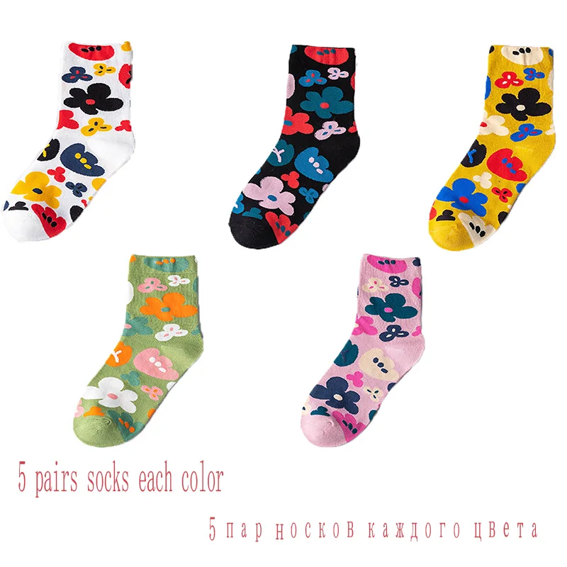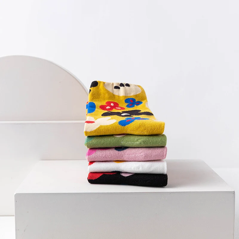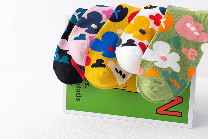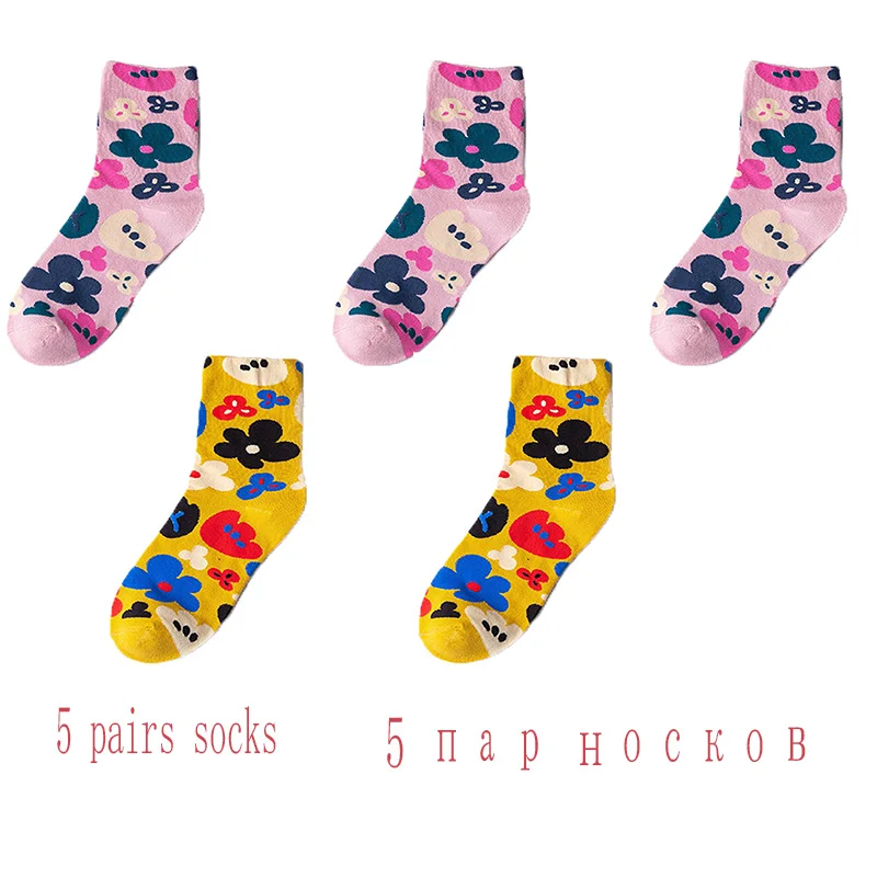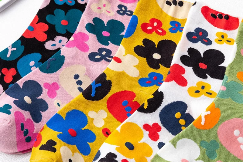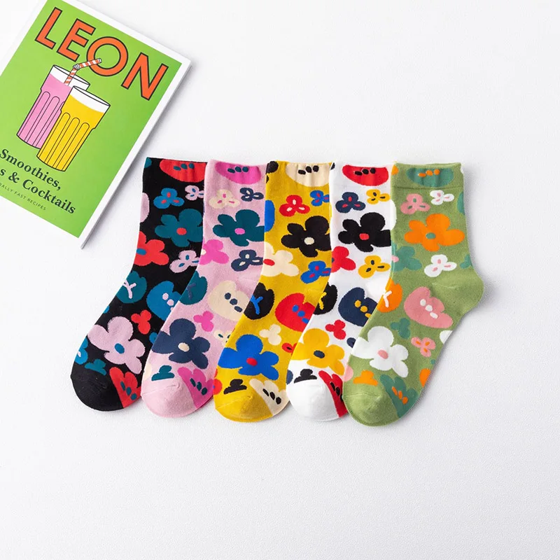 5 пар в партии, Забавный; С цветочным принтом; Хлопковые женские нескользящих носочков, высокое качество, на каждый день, в стиле Харадзюку для девочек Симпатичные носки для женщин, подарки набор