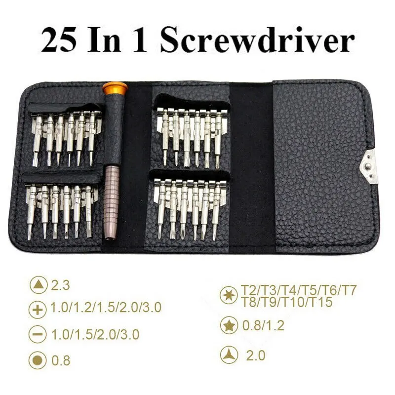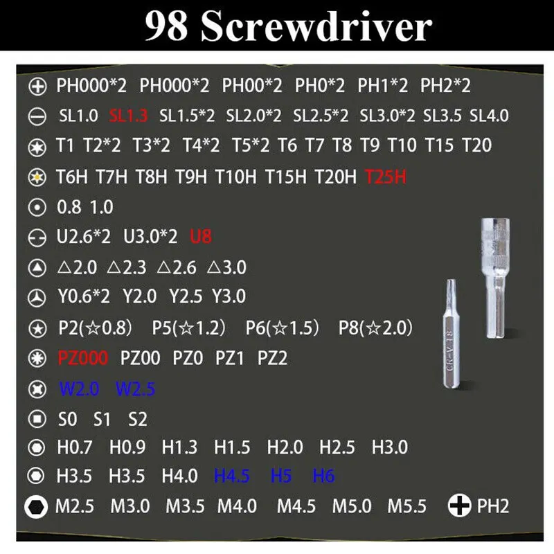 Torx: T1, T2 * 2, T3 * 2, T4 * 2, T5 * 2, T6, T7, T8, T9, T10, T15, T20, T6H, T7H, T8H, t9H, T10H, T15H