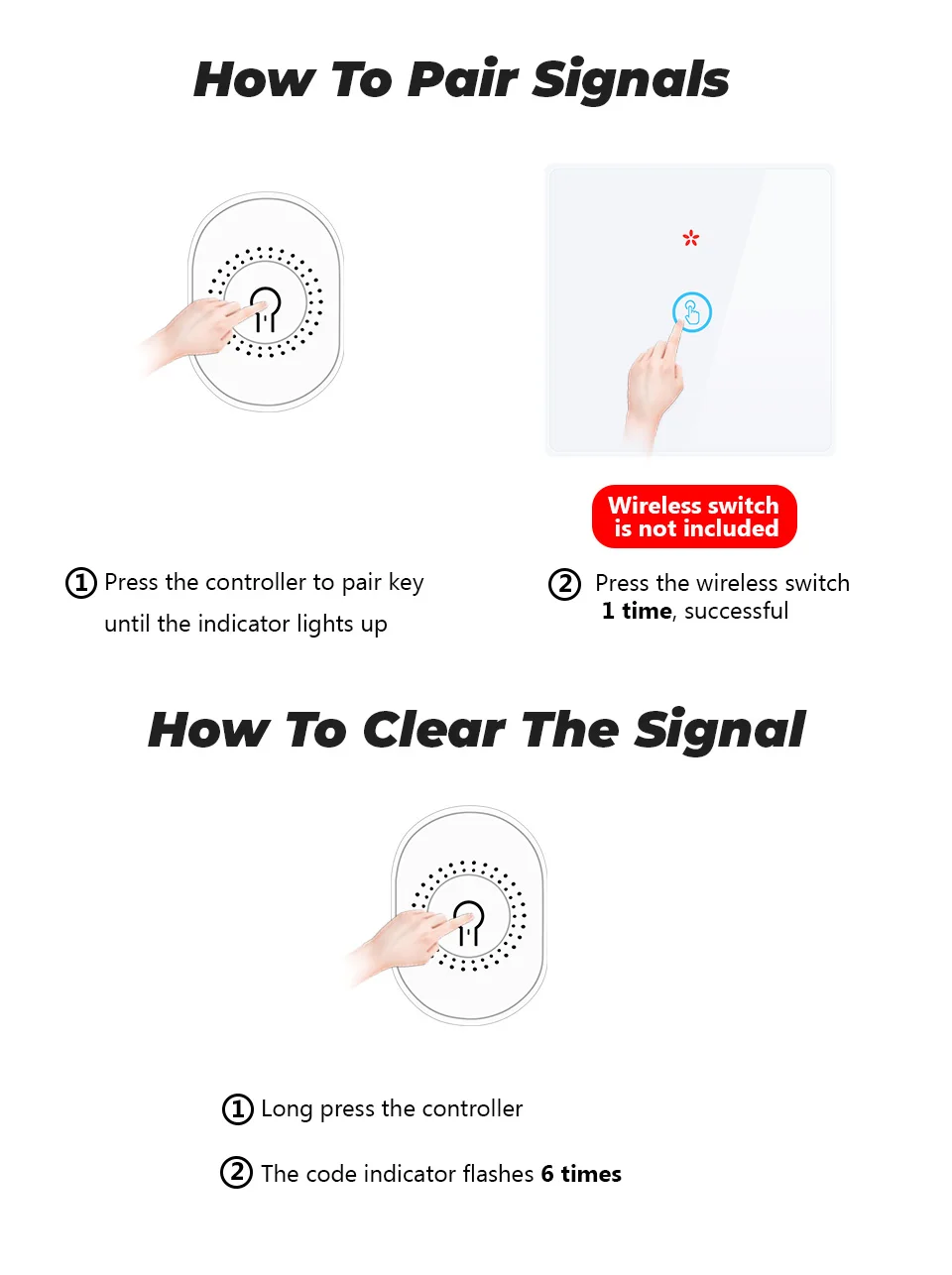 1. Нажмите на контроллер, чтобы подключить ключ, пока индикатор не загорится2. Нажмите беспроводной переключатель 1 раз, успешноКак очистить сигнал1. Длительное нажатие на контроллер2. Индикатор кода мигает 6 раз