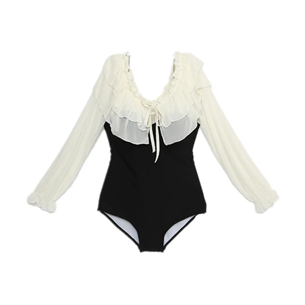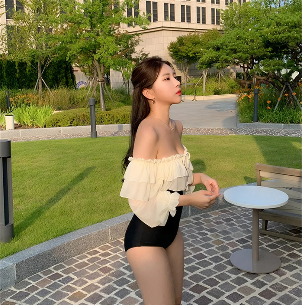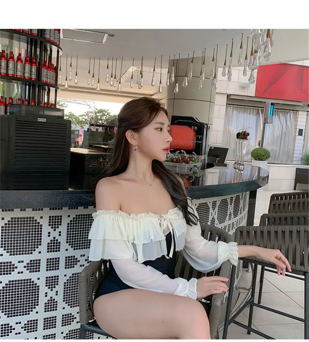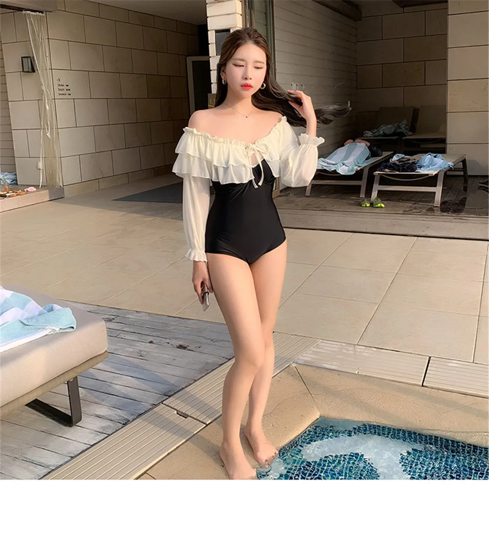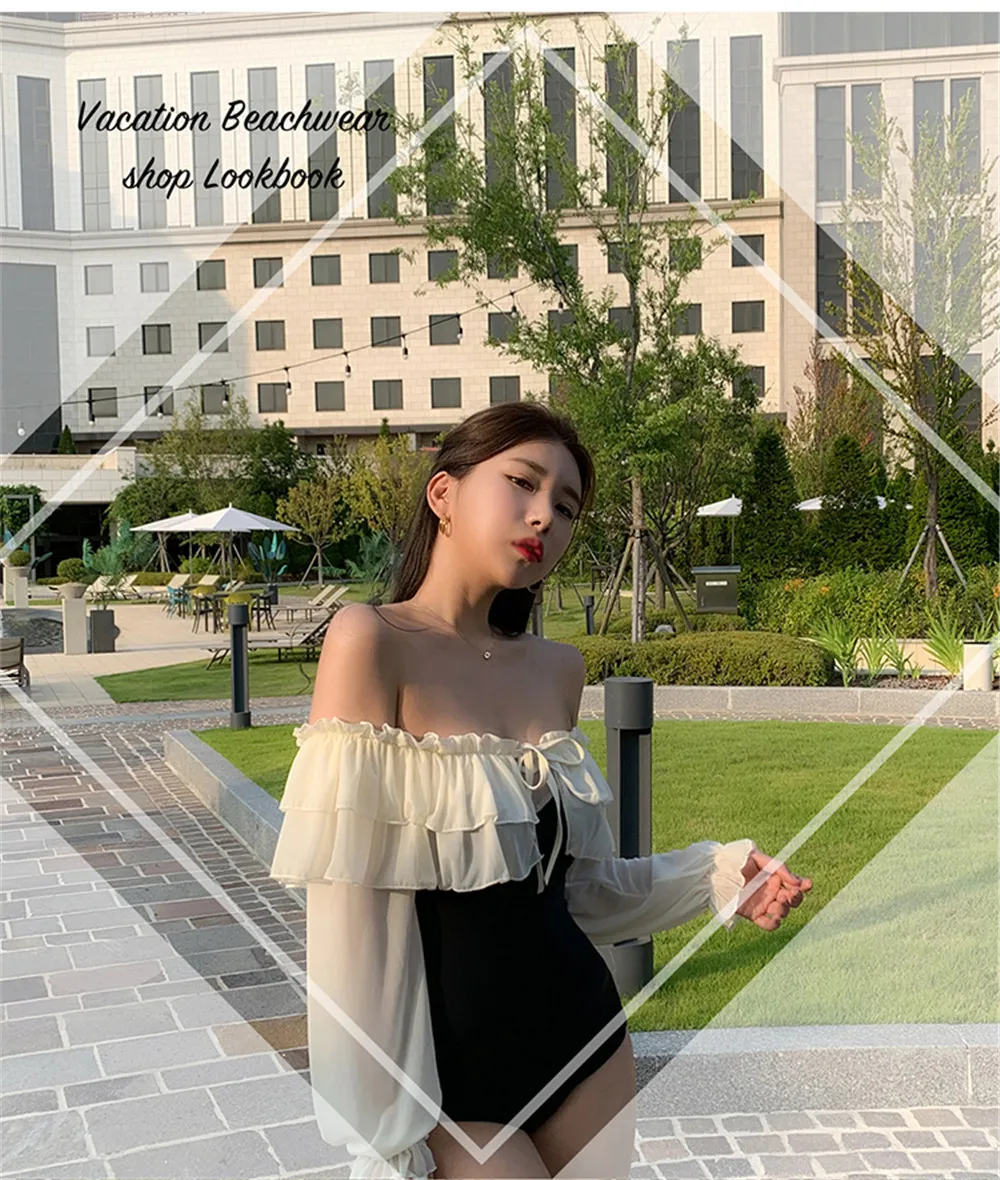 Женский слитный купальник с открытыми плечами, однотонный, с оборками, шифоновый, с длинным рукавом, с открытой спиной