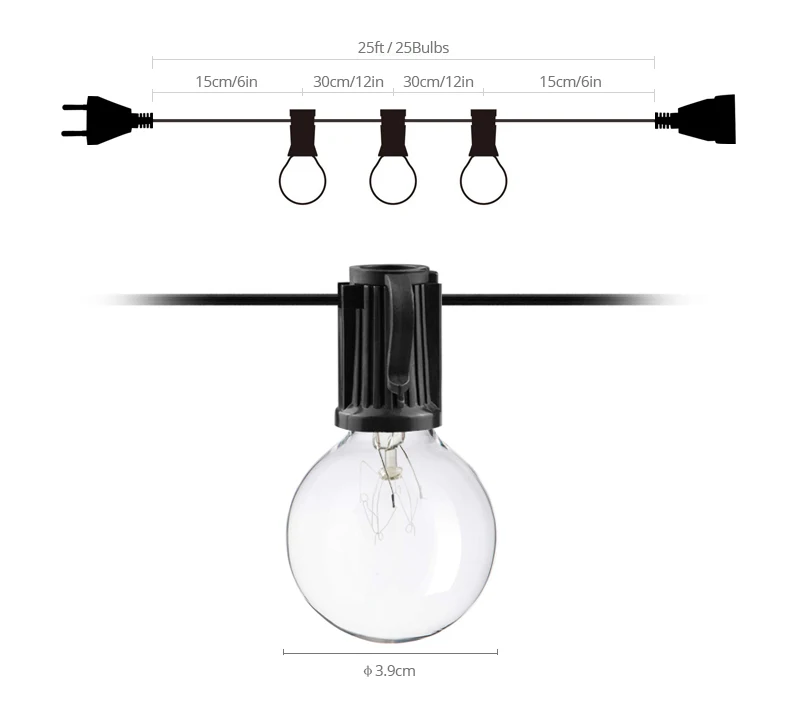 Входное напряжение: AC220V-240V (вилка европейского стандарта); AC110V-130V (вилка стандарта США)Цвета освещения: теплый белыйМощность: 175 Вт (220 В); 125 Вт (110 В)Тип основания: E12Тип лампы: G40 (стеклянная оболочка)Количество ламп: 25 шт.Водонепроницаемость: IP44Срок службы лампы: 10000 часовЦветовая температура: 2000-2200KМатериал изделия: медь и стеклоЦвет провода: черныйИнтервал лампы: 12 дюймовДлина: 6 м/25 футовТип вилки: штепсельная вилка Европейского или американского стандартаПодключение до макс. 3 прядей
