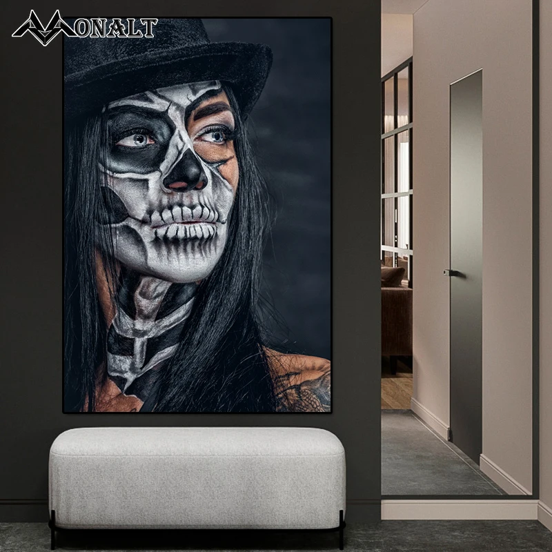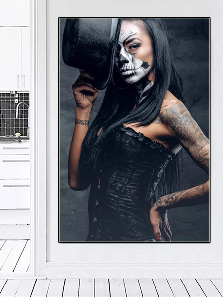 Черная шляпа, Череп, татуировка, сексуальная крутая девушка, женщина, плакат, современный поп-арт, холст, живопись, печать, довольно хрупкий портрет, картины для дома