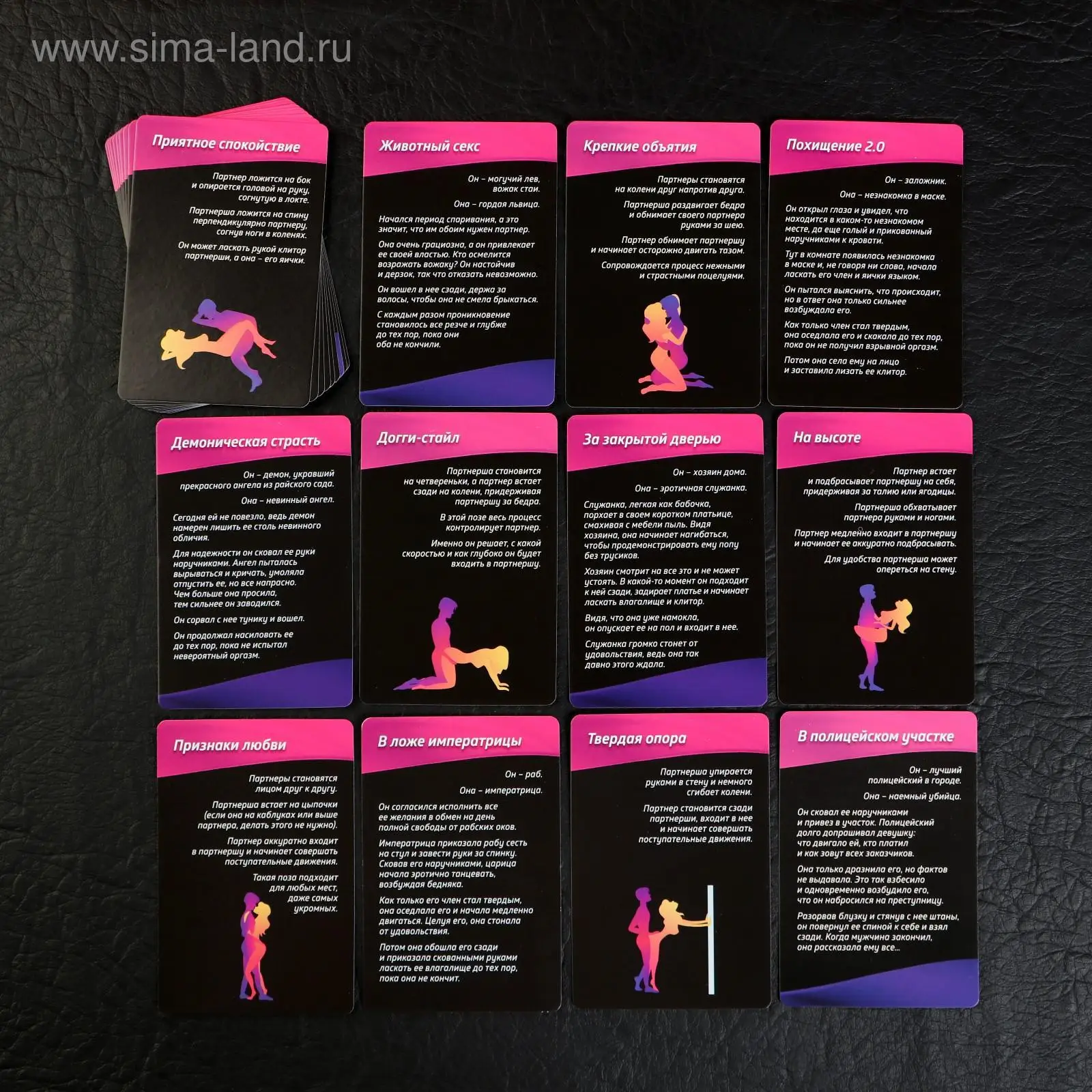 Также мы подготовили для вас карточки «Позы». По очереди вытягивайте их, зачитывайте описание и смотрите на картинку. Вот и всё, осталось только воплотить её в жизнь!