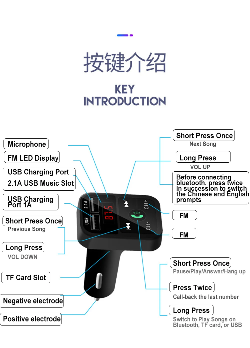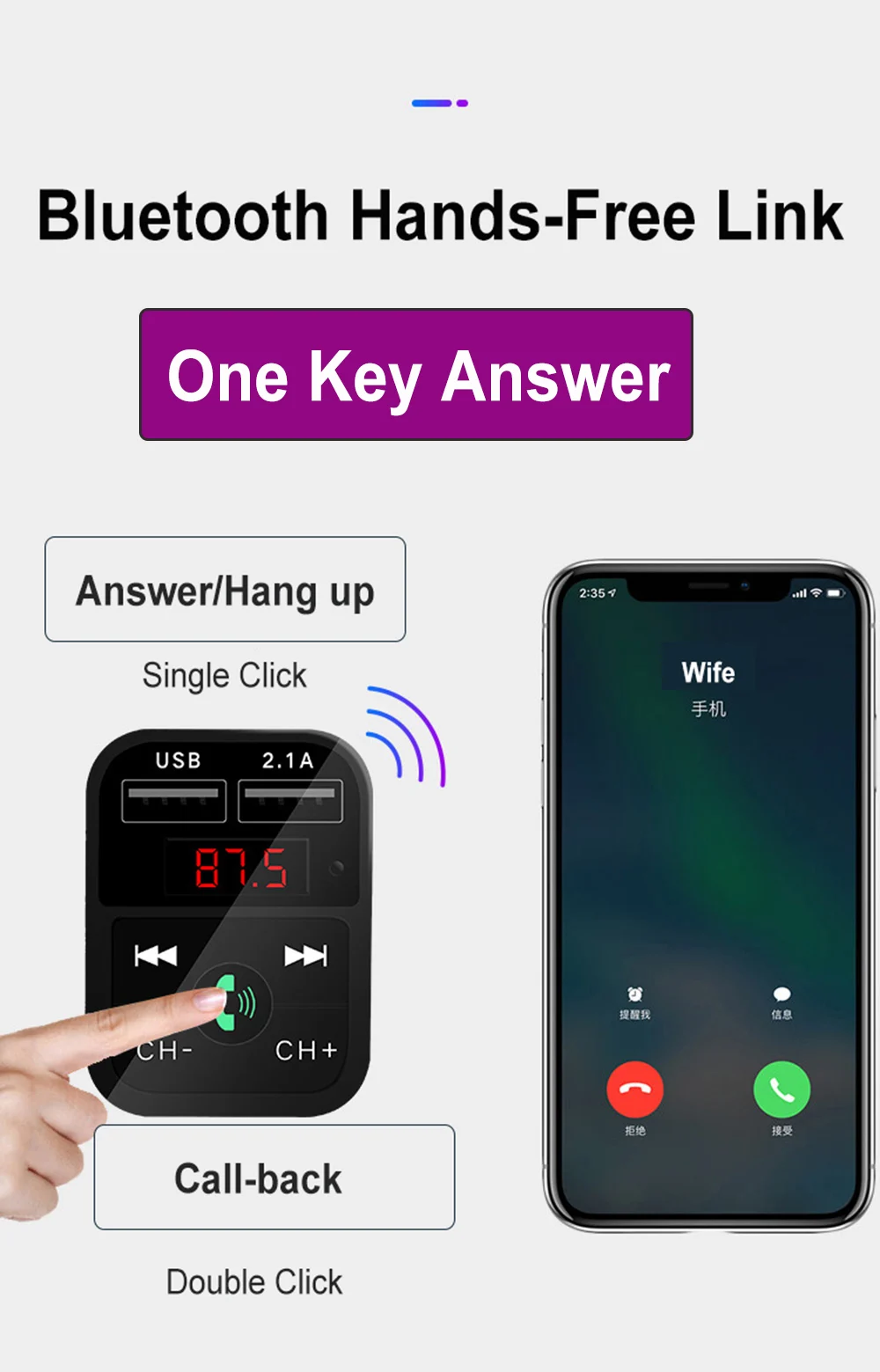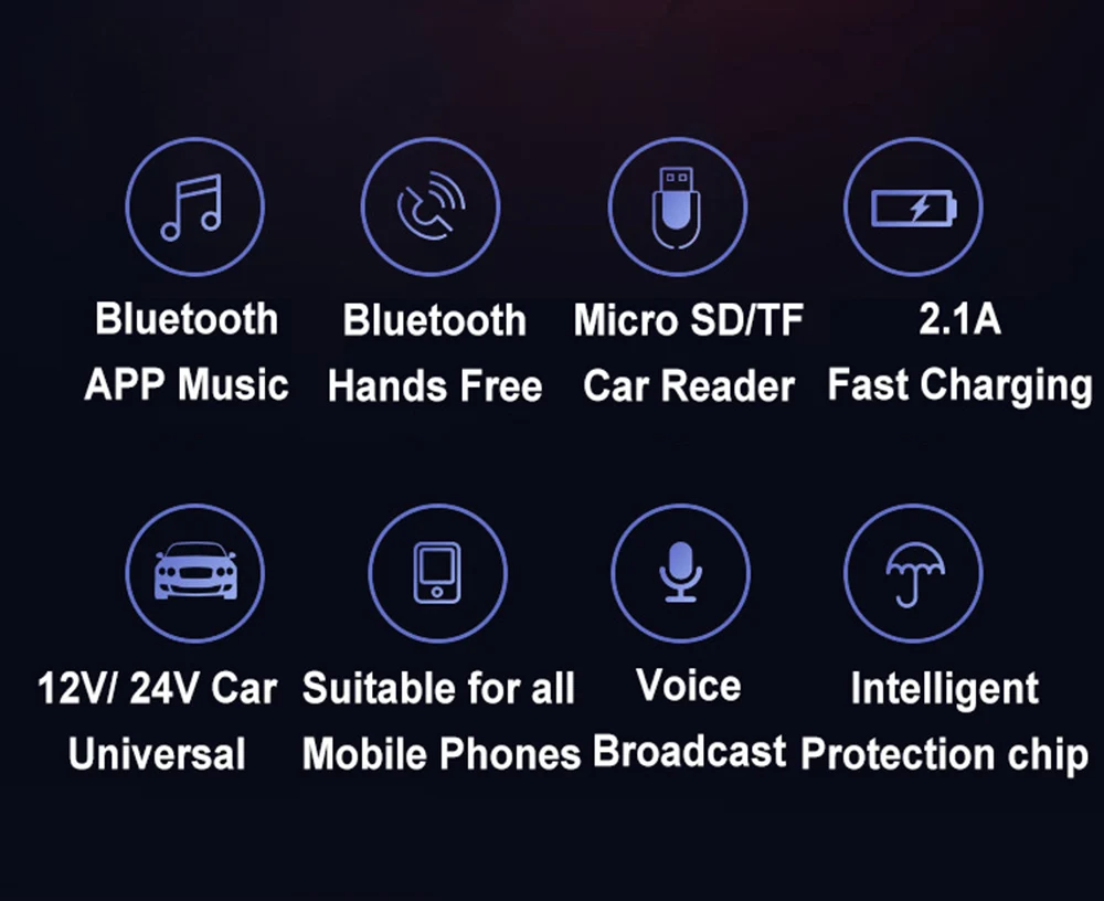 Описание:Интерфейс: высокоскоростной USB2.0Экран: светодиодныйИсточник питания: мощность прикуривателяВыход USB: 2.1AТип карты памяти: tf-картаПоддержка tf-карты/U емкость диска: ≤ 16 ГбИсточник питания: DC12-24VПоддержка типа файла: MP3/WMAРабочий ток: 50-100mA DC12VСкорость передачи бит: 64-320kbpsДиапазон частот FM: 87,5-108 МГцОтношение сигнал-шум: 85 дБ (FM: 65 дБ)Гармонические искажения: <0.05% FM: <0.1%)Рабочая температура: 0 °C-60 °CПодходящие модели: DC12V -24V универсальныеРасстояние запуска <5 метровМатериал: АБС-пластикЦвет: черныйРазмер: 8х5х3, 7 см Особенности:Этот продукт использует полночастотную технологию беспроводной передачи FM и может напрямую считывать аудиофайлы на мобильный телефон с Bluetooth/tf-картой/U-диском.Поддерживает воспроизведение аудио по Bluetooth и звонки по громкой связи по Bluetooth. Поддержка функции интеллектуального приложения, декодирование аудио без потерь высокого качества.Usb функция зарядки автомобиля В многофункциональном автомобиле MP3.Зарядное устройство USB2.1A, версия Bluetooth 4,1.Поддержка Bluetooth/tf-карты/U disk player, Bluetooth hands-free вызов экран может показать частоту.Поддержка функции питания и памяти.Поддержка зарядки во время прослушивания песен.Точный структурный дизайн, внешний вид фортепианной краски.Функция шумоподавления, встроенная схема шумоподавления, делает звук вызова более четким. Посылка включает в себя:1 автомобильный mp3-плеер