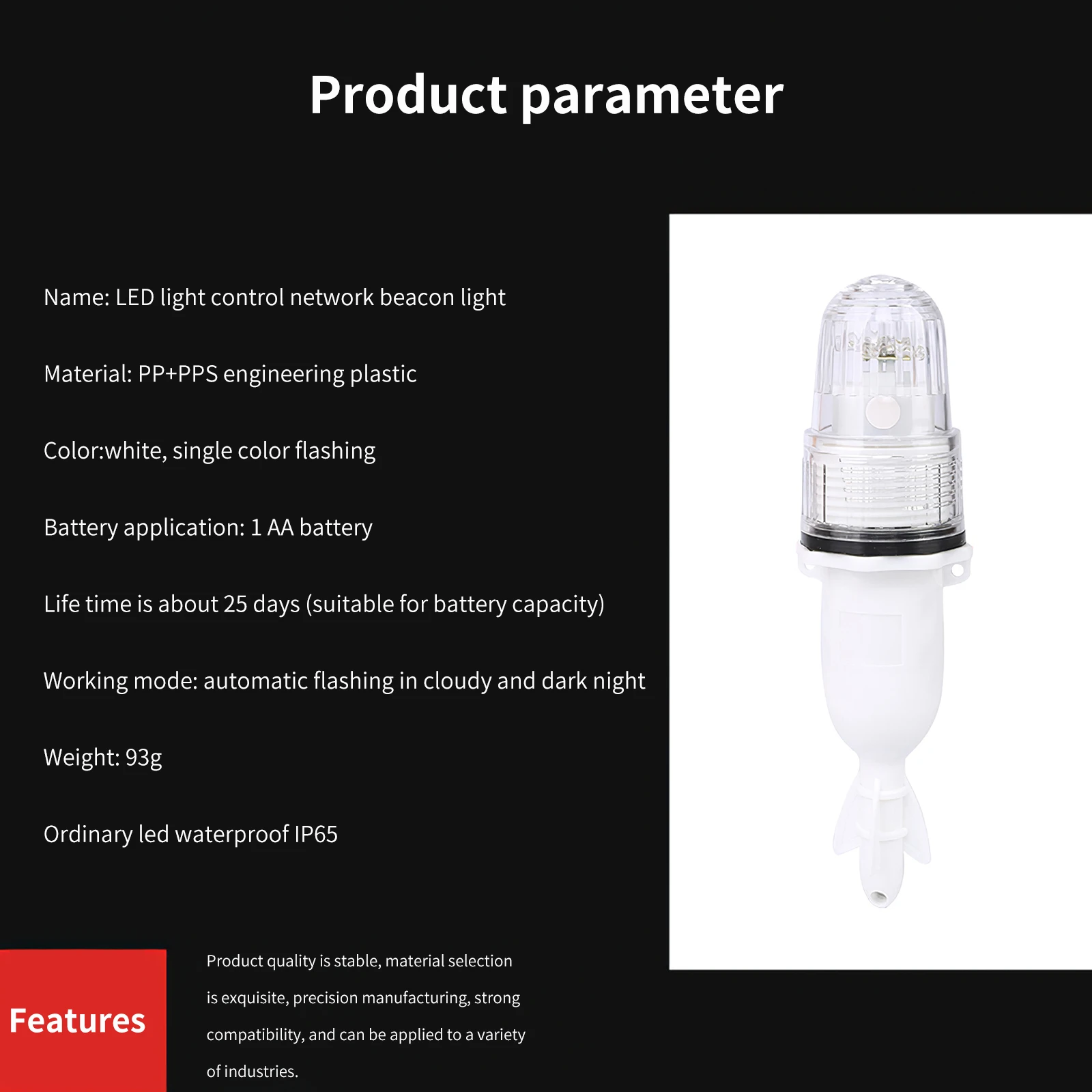 ВодонепроницаемыйСтепень водонепроницаемости морской светильник управляемый сетевым маяком светильник IP65, и толстое уплотнительное кольцо принимается, что имеет очевидный водонепроницаемый эффект.Интеллектуальный светильникЭтот продукт использует интеллектуальную технологию управления светильник, он будет светиться только в пасмурную или темную ночь и автоматически выходить под солнцем.ПортативныйПродукт небольшой и легкий, весит всего 100 г (3,53 унций), что очень удобно носить с собой.Питание от аккумулятораПродукт питается от аккумулятора No.1 (не входит в комплект), время работы до 25 дней, низкое потребление и энергосбережение.Широкое применениеШироко используется в различных отраслях промышленности, таких как ночная рыбалка, вспомогательные огни для рыболовных сетей, предупреждающие огни для рыболовных лодок и т. д.Характеристики:Тип: светильник, управляемый сетевым маяком, светильникМатериал: PP + PPSКоличество: 1 шт.Цвет изделия: синий/зеленый/красный/желтый/белыйАккумулятор: 1 * нет. 1 батарея (не входит в комплект)Светильник источник света: светодиодныйКласс водонепроницаемости: IP65Время работы: 25 днейРазмеры: 5,8*21 см/2,28*8,25 дюйма (Д * В)Вес: 100 г/3,53 унцийУпаковка:1 * светильник управления сетевой маячный светильник