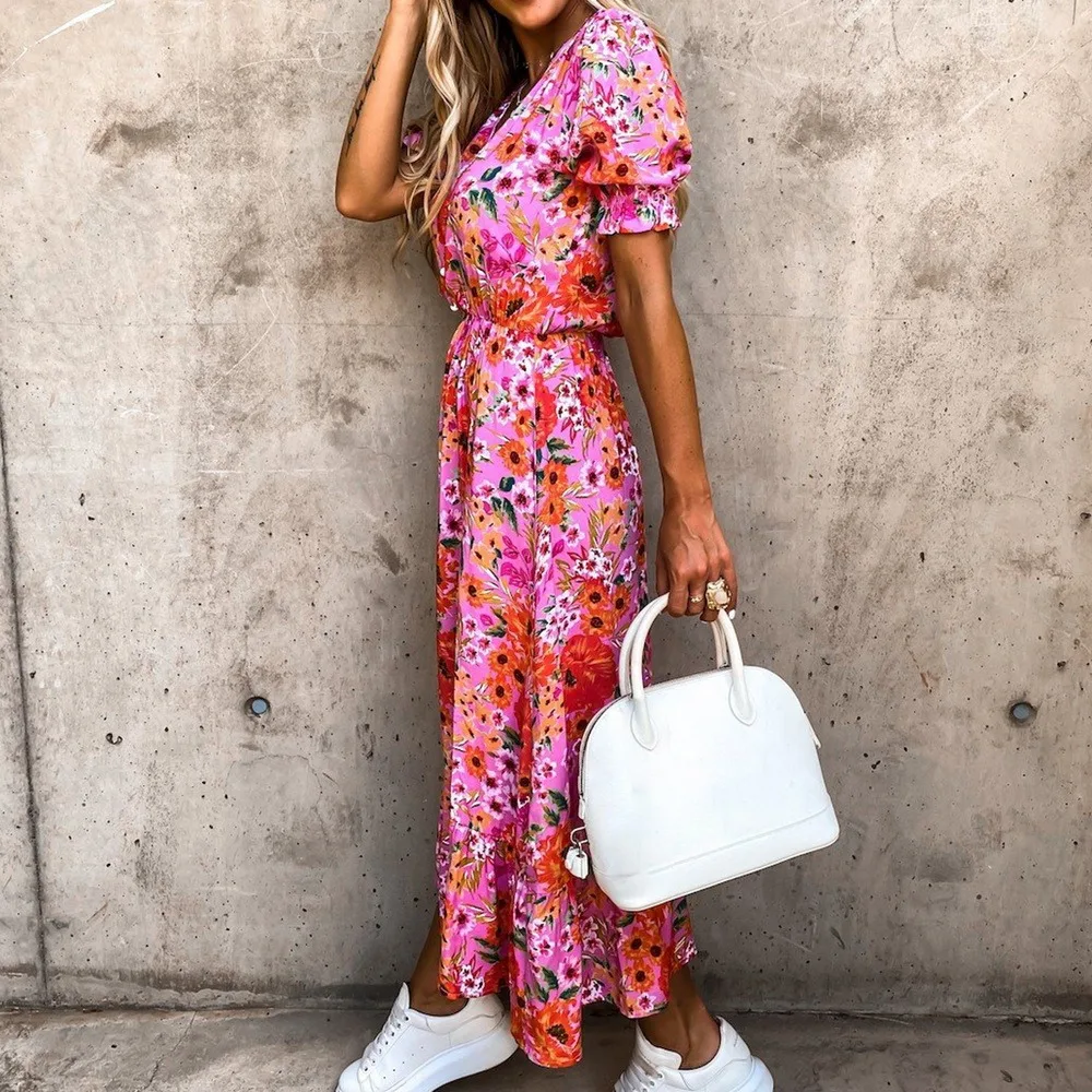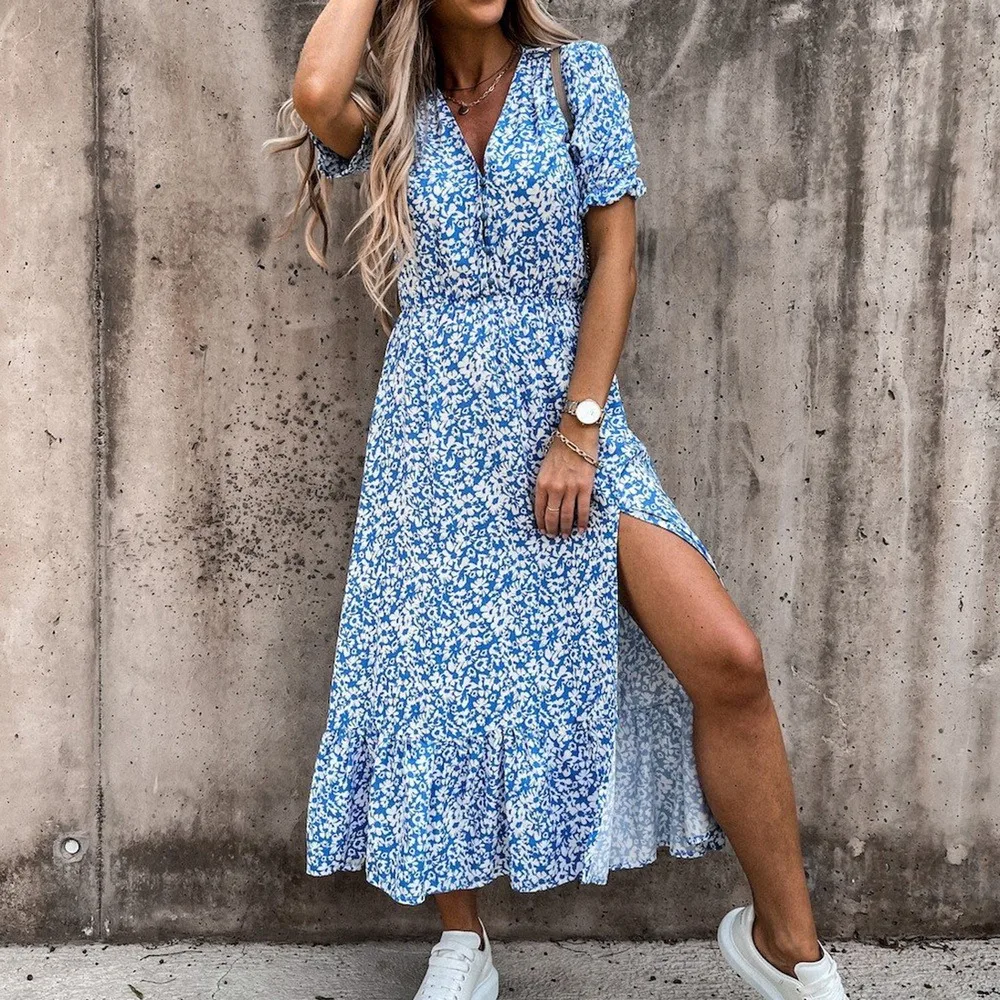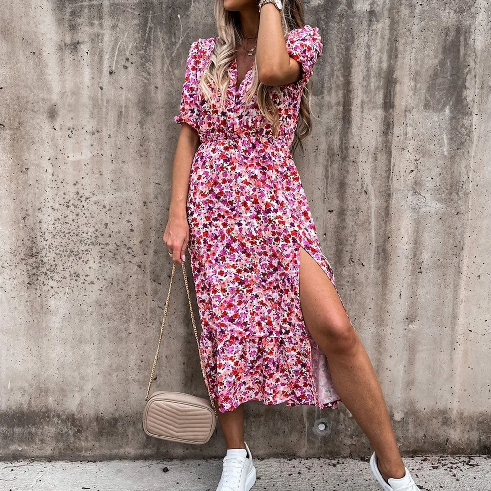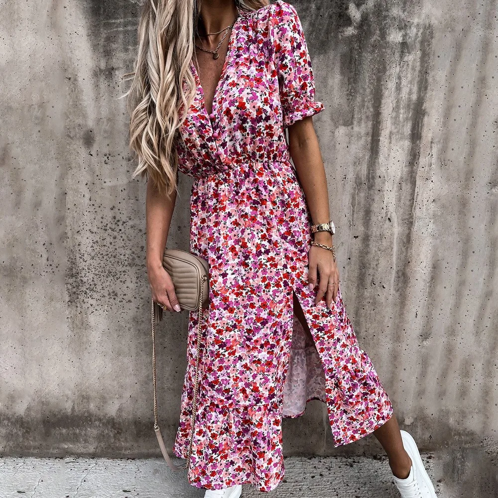 Летнее женское платье с цветочным принтом 2021, сексуальные длинные вечерние платья с V-образным вырезом, Повседневное платье-макси с коротким рукавом и разрезом, женские платья, платье