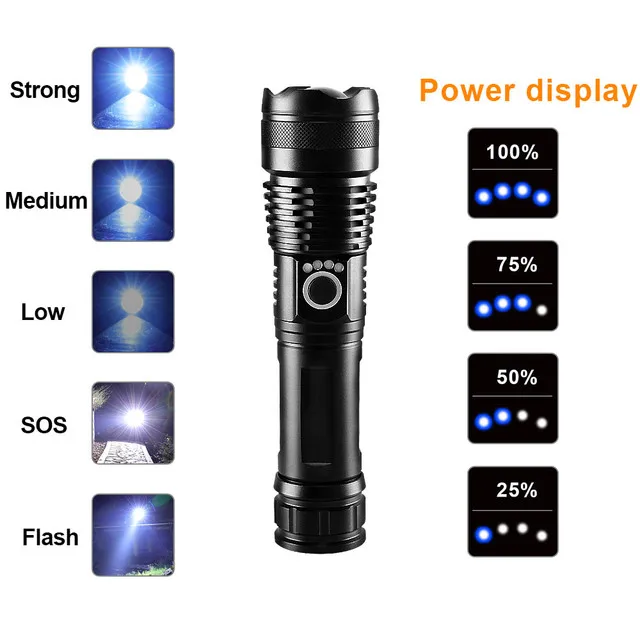 Цвет излучения: светильникРежим масштабирования: телескопический зумМатериал корпуса: алюминиевый сплавРазмер (см):18*4,3*3,5 смДисплей мощности: ДаСпособ зарядки: зарядка через USB (вход и выход, с функцией мобильного питания, можно заряжать мобильные телефоны)Подходит для ночного кемпинга, рыбалки, работы, охоты, походов, спелеологии, приключений и т. д.