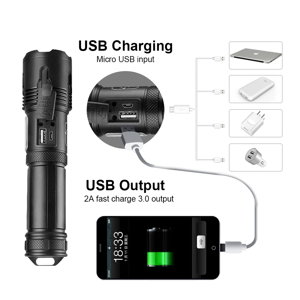 Цвет излучаемого света: белый светильникРежим масштабирования: телескопический зумМатериал корпуса: алюминиевый сплавРазмер (см):18*4,3*3,5 смДисплей питания: ДаСпособ зарядки: USB зарядка (вход и выход, с функцией мобильного питания, можно заряжать мобильные телефоны)Подходит для ночного кемпинга, рыбалки, работы, охоты, пеших прогулок, катания, приключений и т. д.